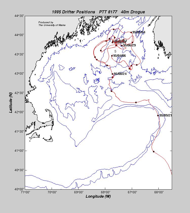 Five satellite tracked drifting buoys were deployed between 3-4 April 1995 by the RV Argo Maine.