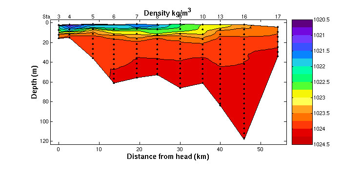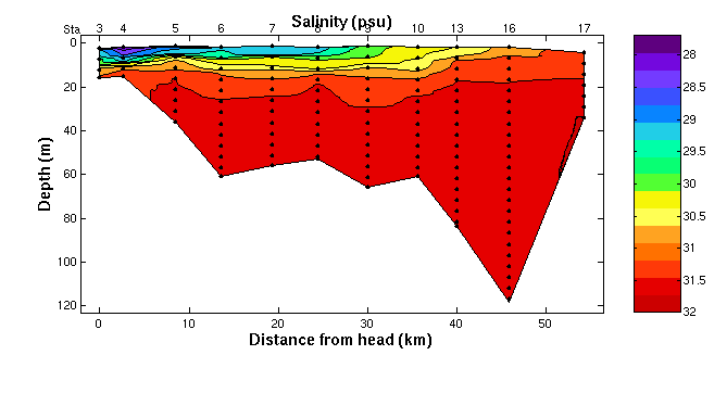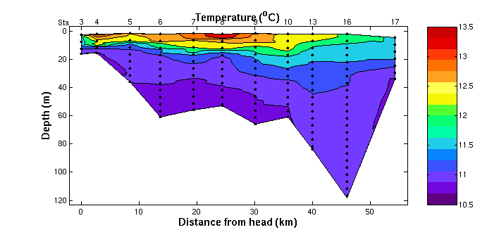 station) from the head of the bay to its mouth. The y-axis is depth. The