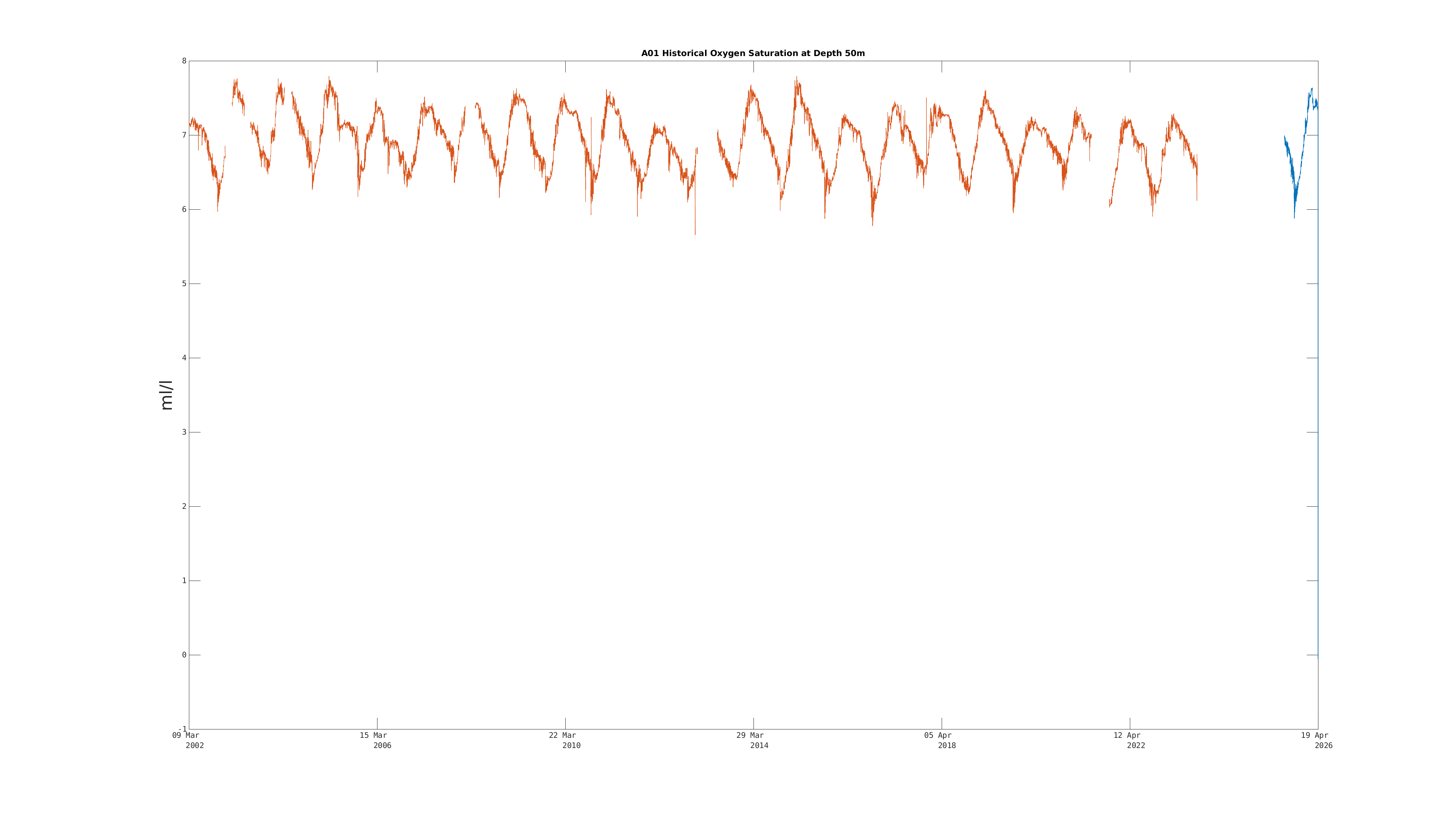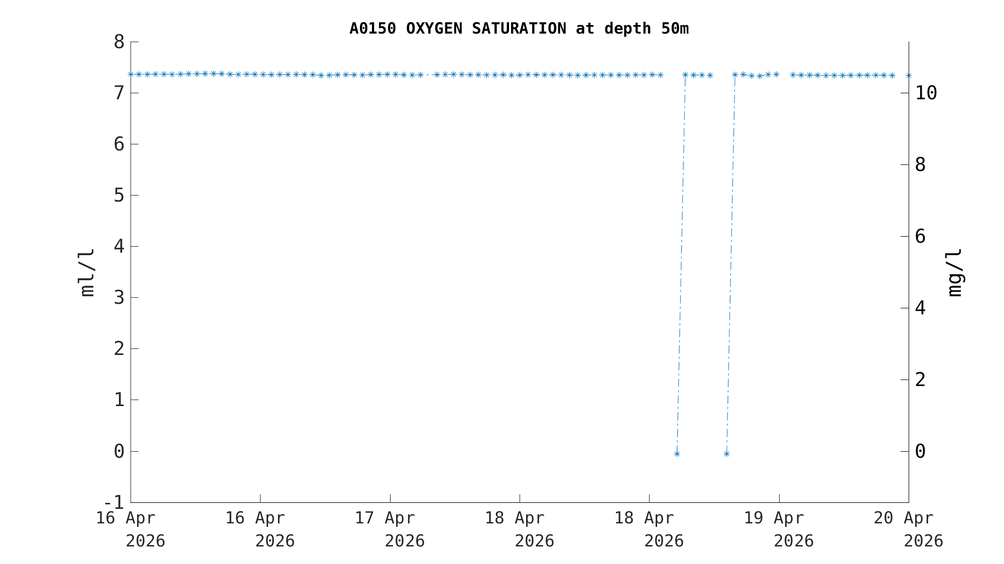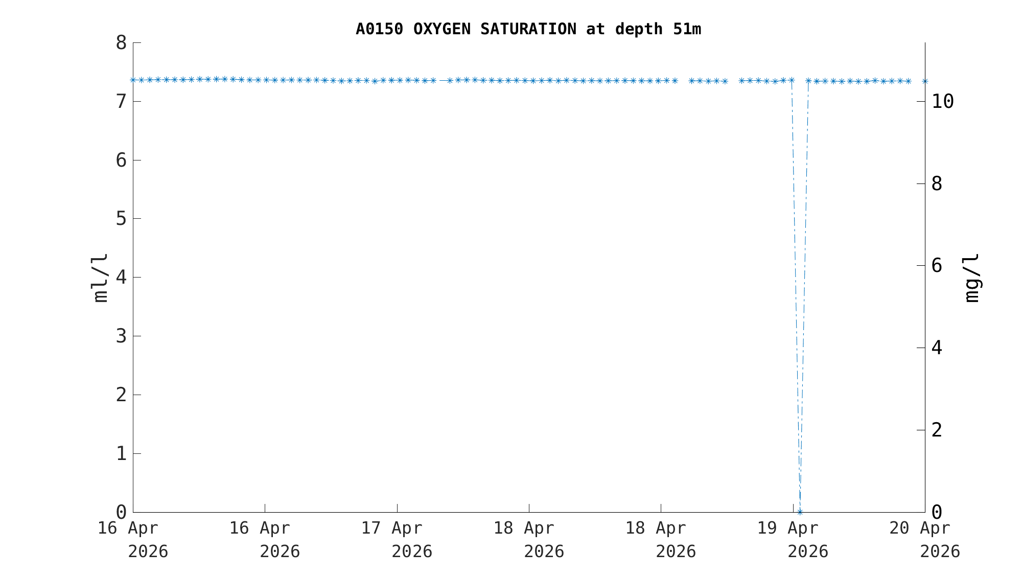 | Oxygen Saturation (50m) | 7.3 ml/l | Apr 19 12:00 PM |