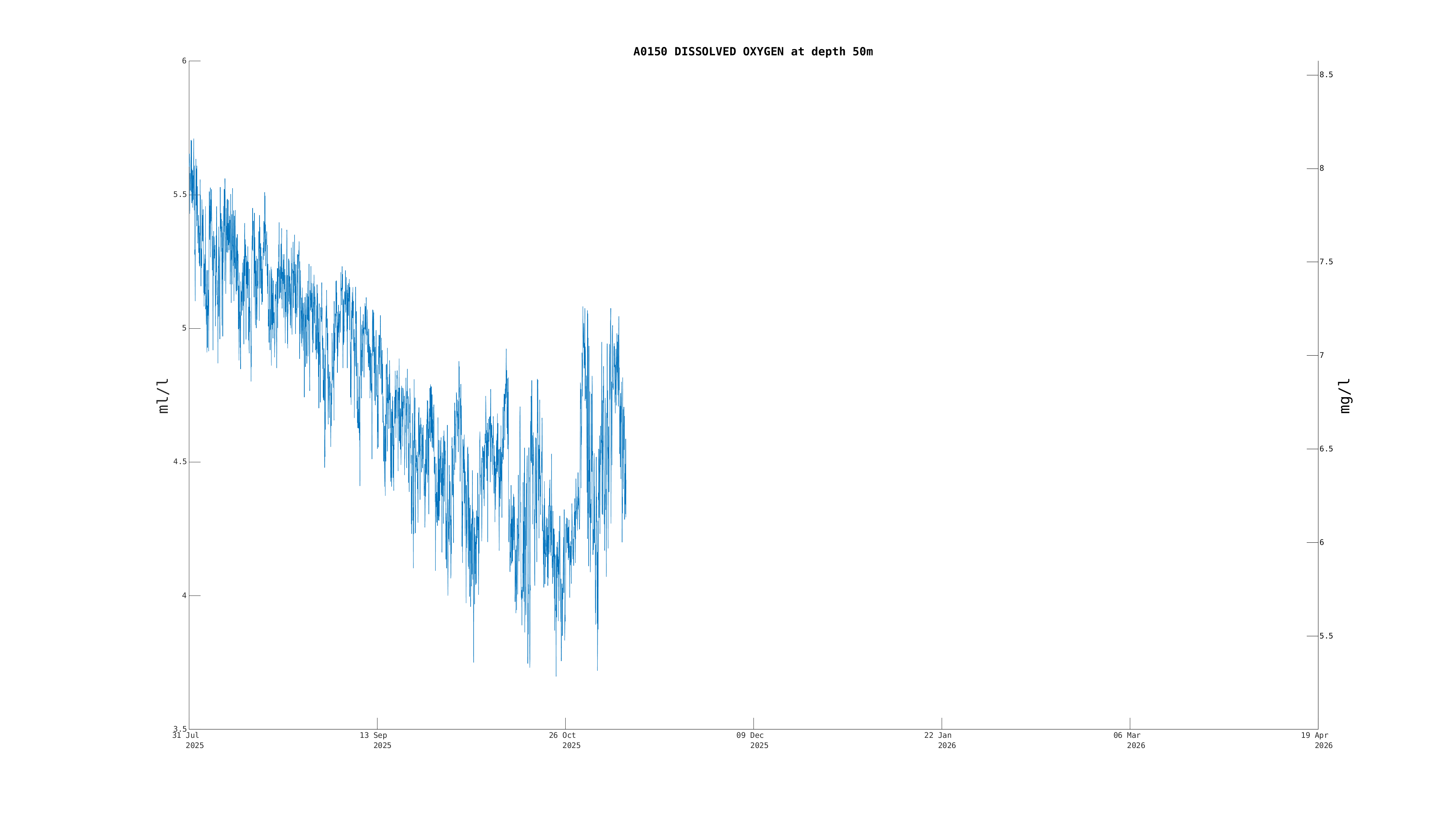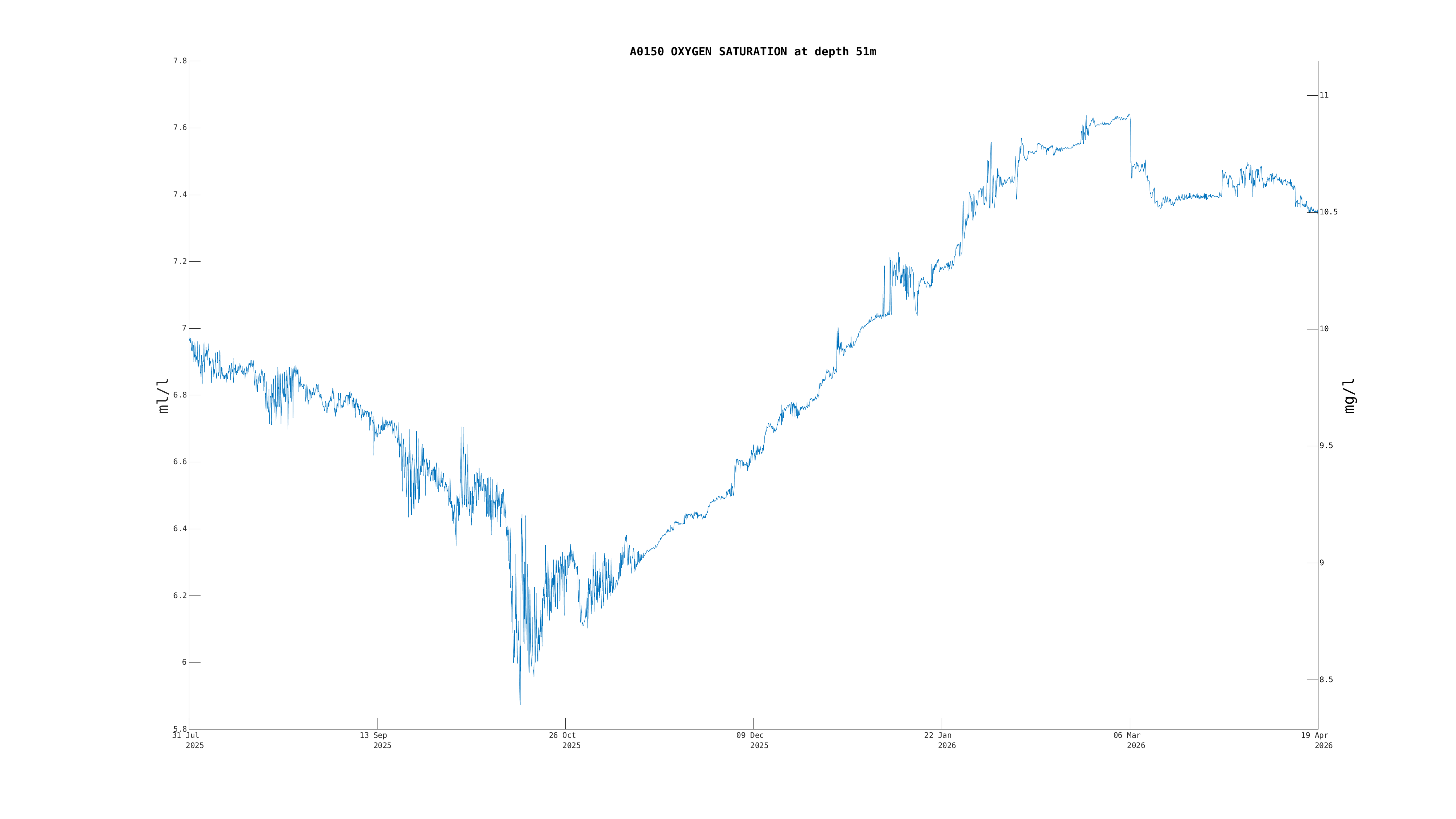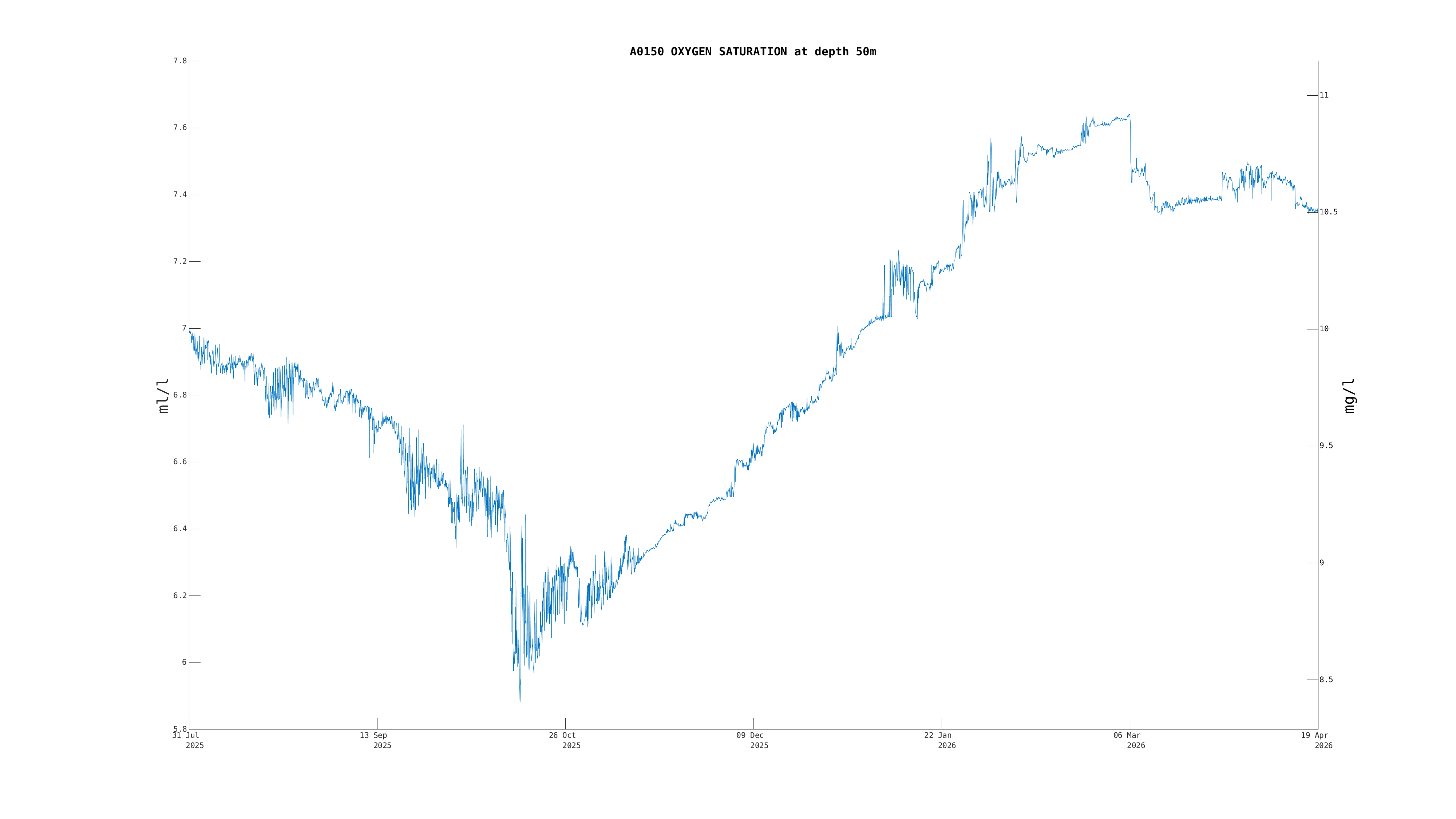 | Oxygen Saturation (50m) | 7.3 ml/l | Apr 19 12:00 PM |