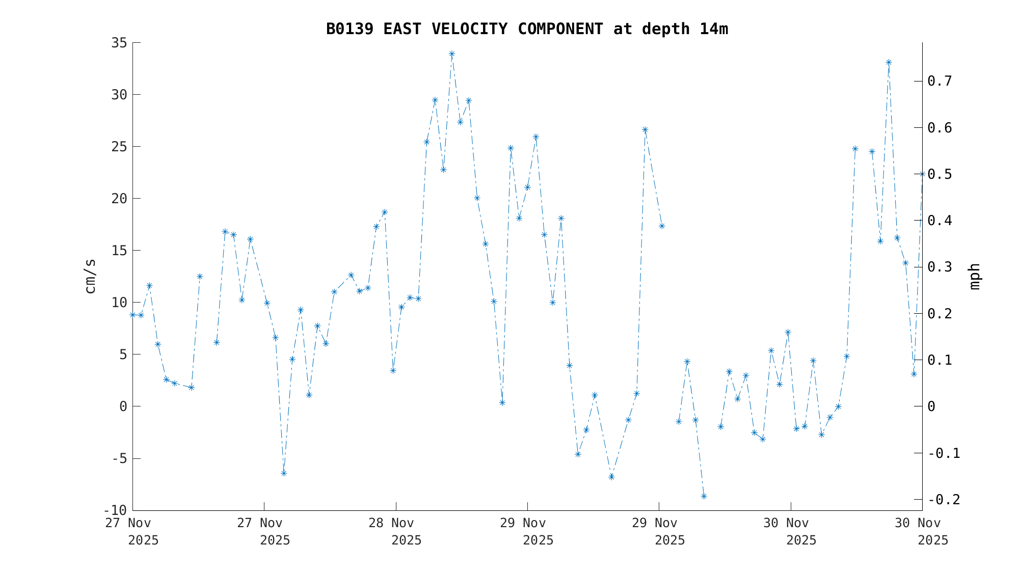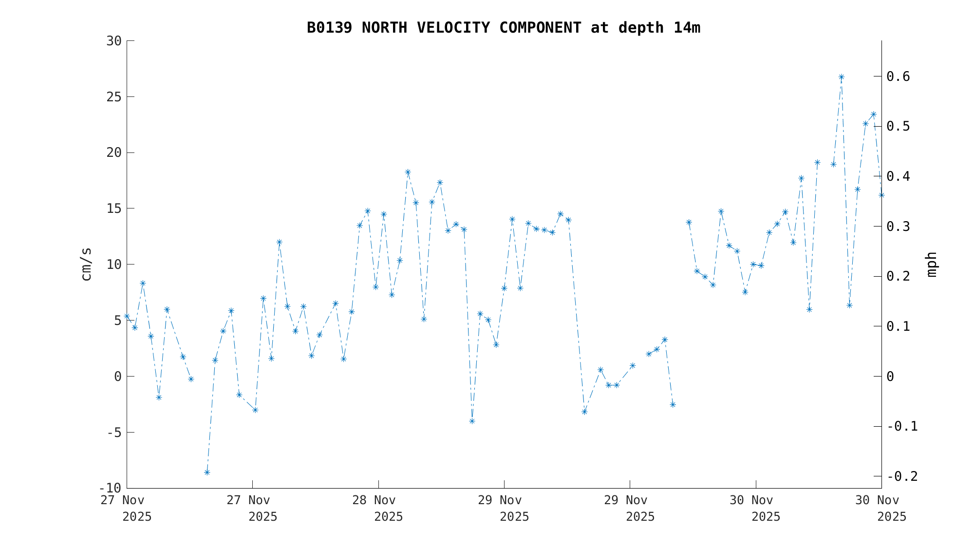 | North Current Velocity (14m) | 7.1 cm/s (0.14 kts) | Dec 08 3:00 PM |