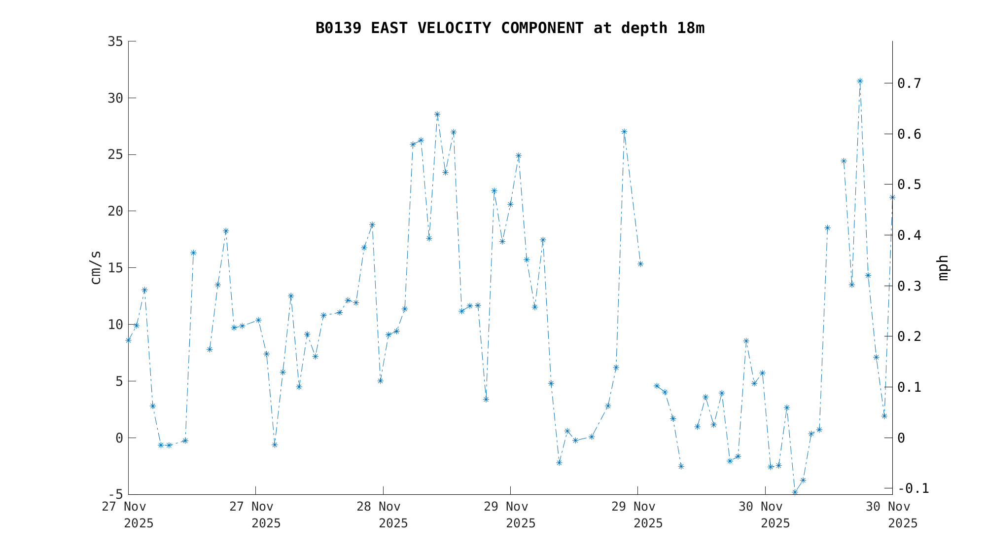 | East Current Velocity (18m) | 5.4 cm/s (0.10 kts) | Dec 08 3:00 PM |
