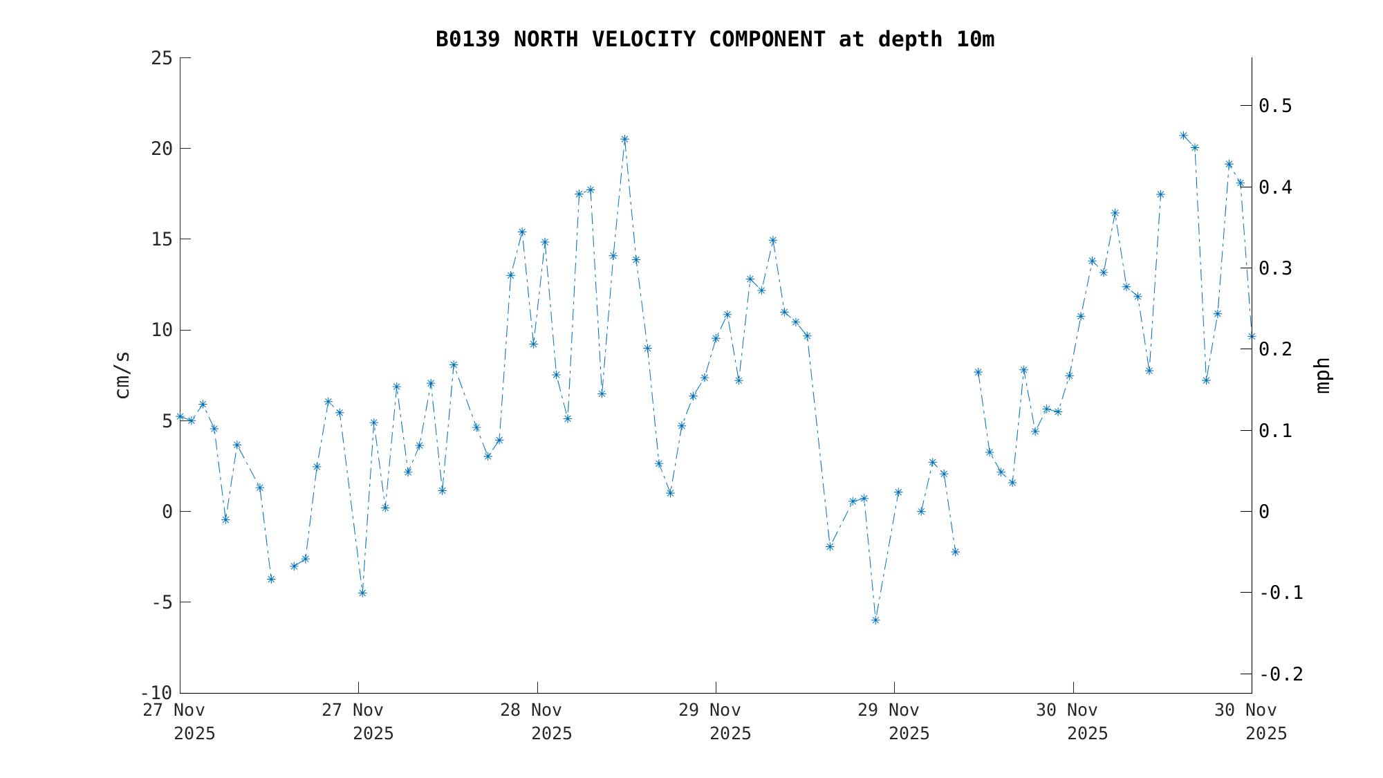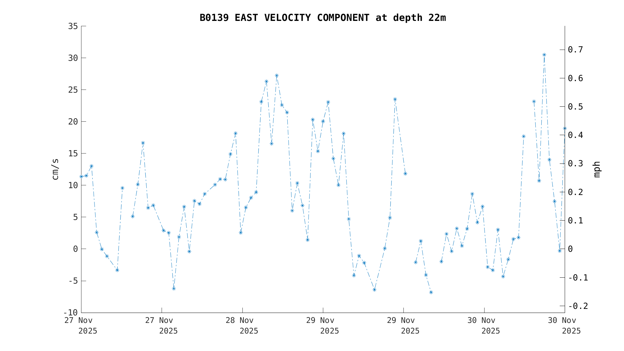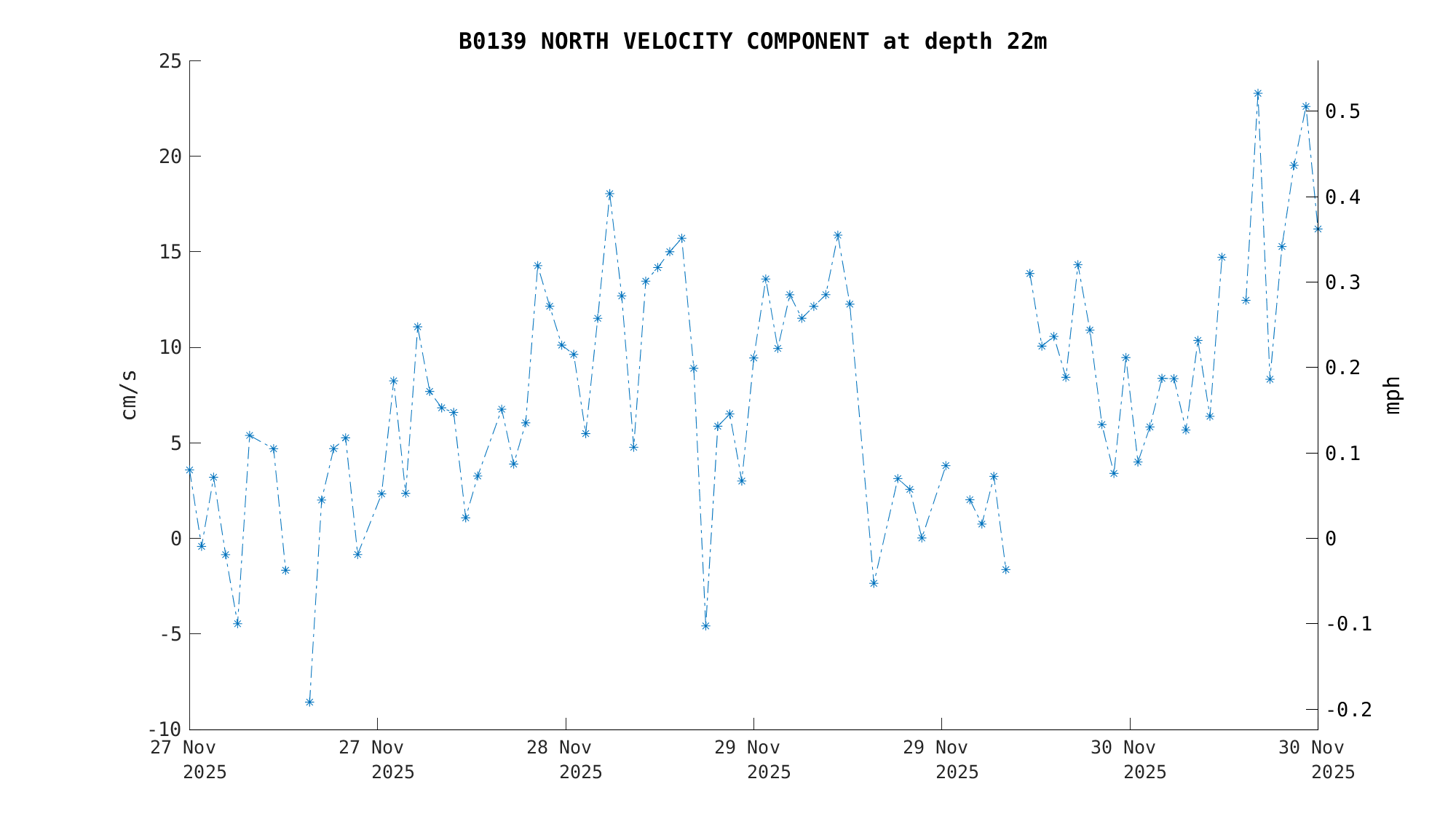 | North Current Velocity (22m) | 6.5 cm/s (0.13 kts) | Dec 08 3:00 PM |