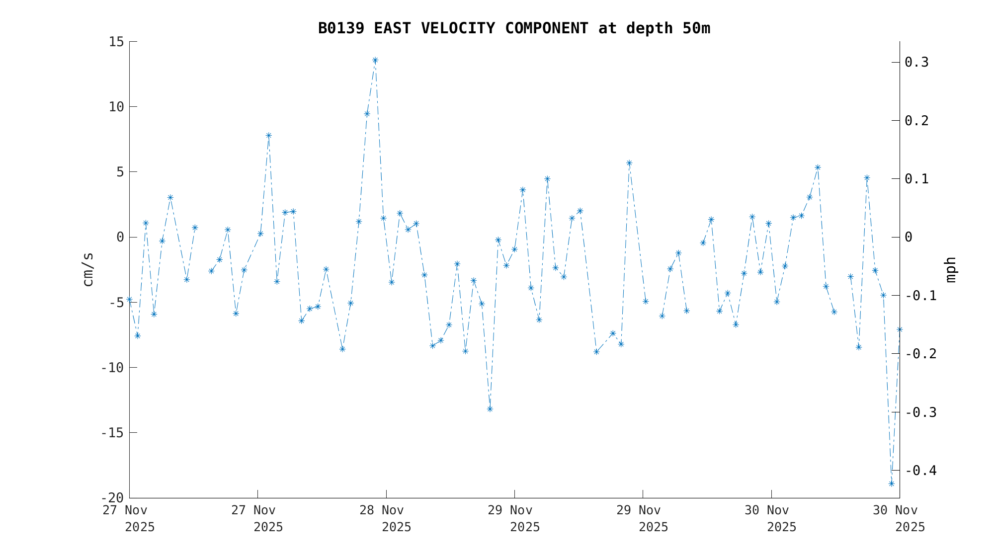 | East Current Velocity (50m) | -8.8 cm/s (-0.17 kts) | Dec 08 3:00 PM |