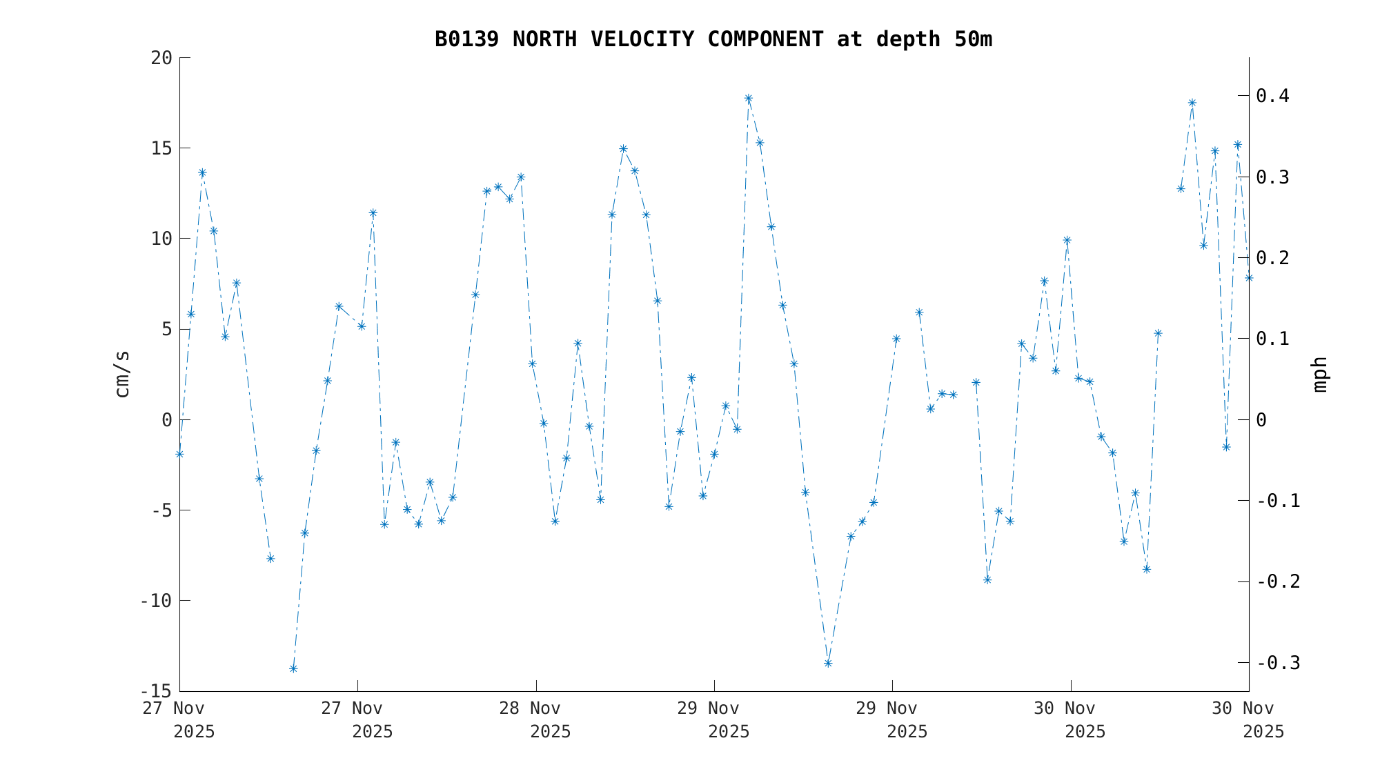 | North Current Velocity (50m) | 6.3 cm/s (0.12 kts) | Dec 08 3:00 PM |