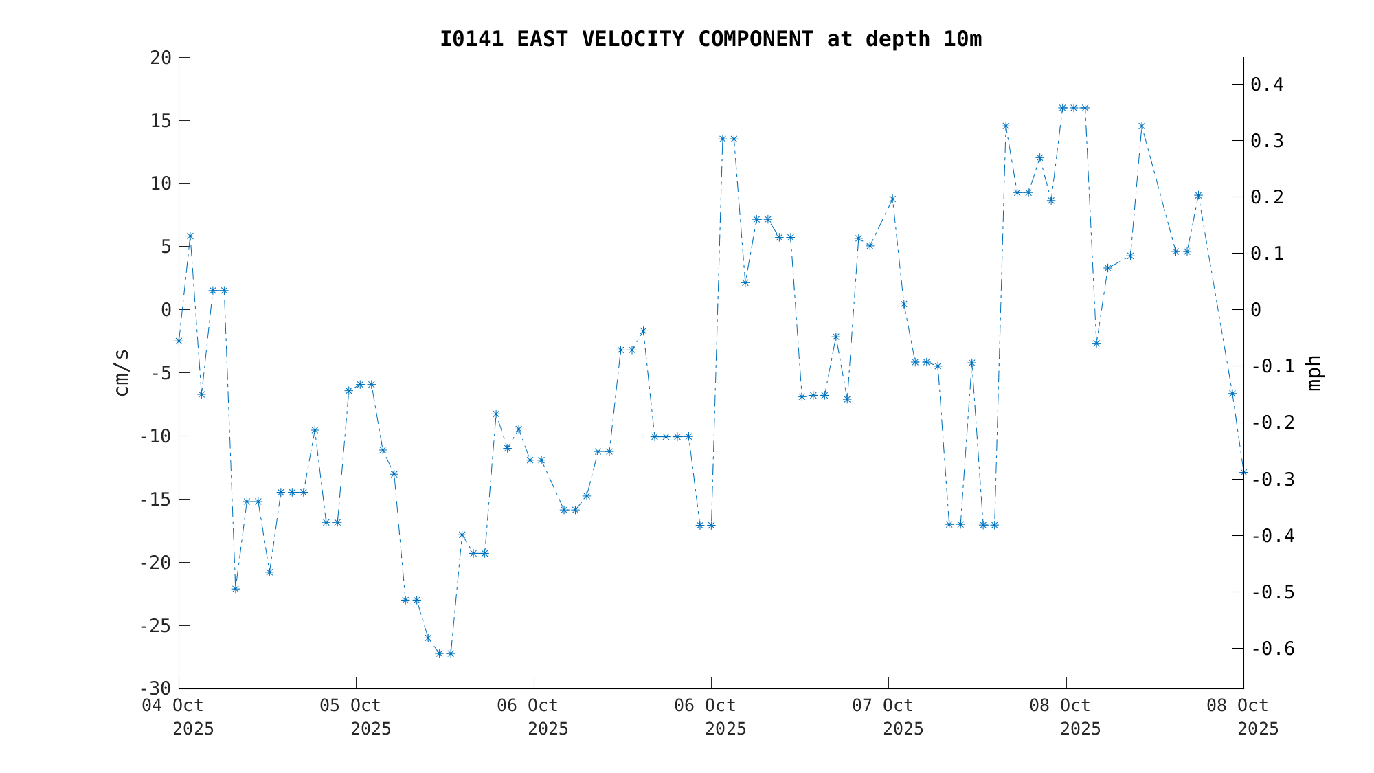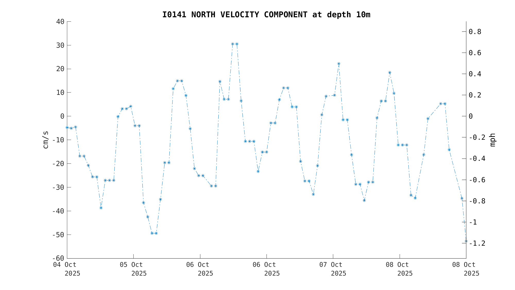 North Current Velocity (10m) | -34.7 cm/s (-0.67 kts) | Oct 08 3:00 PM |