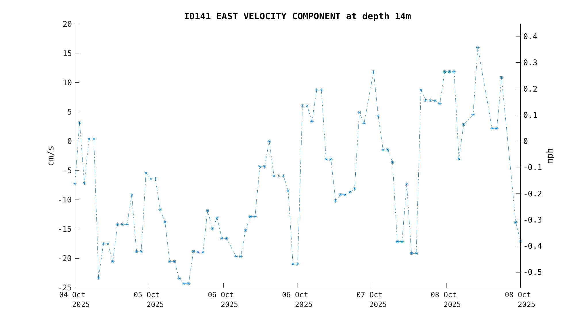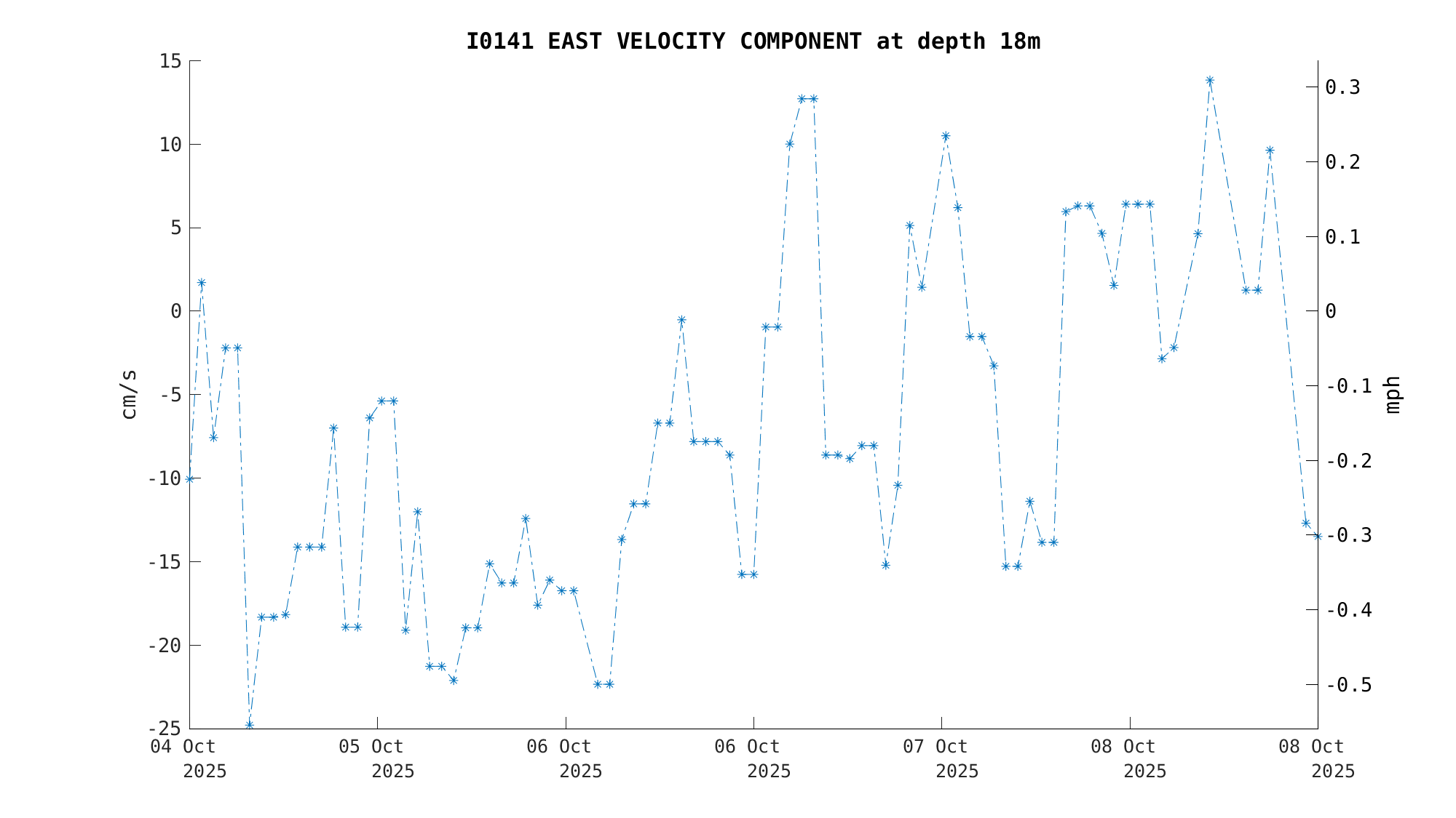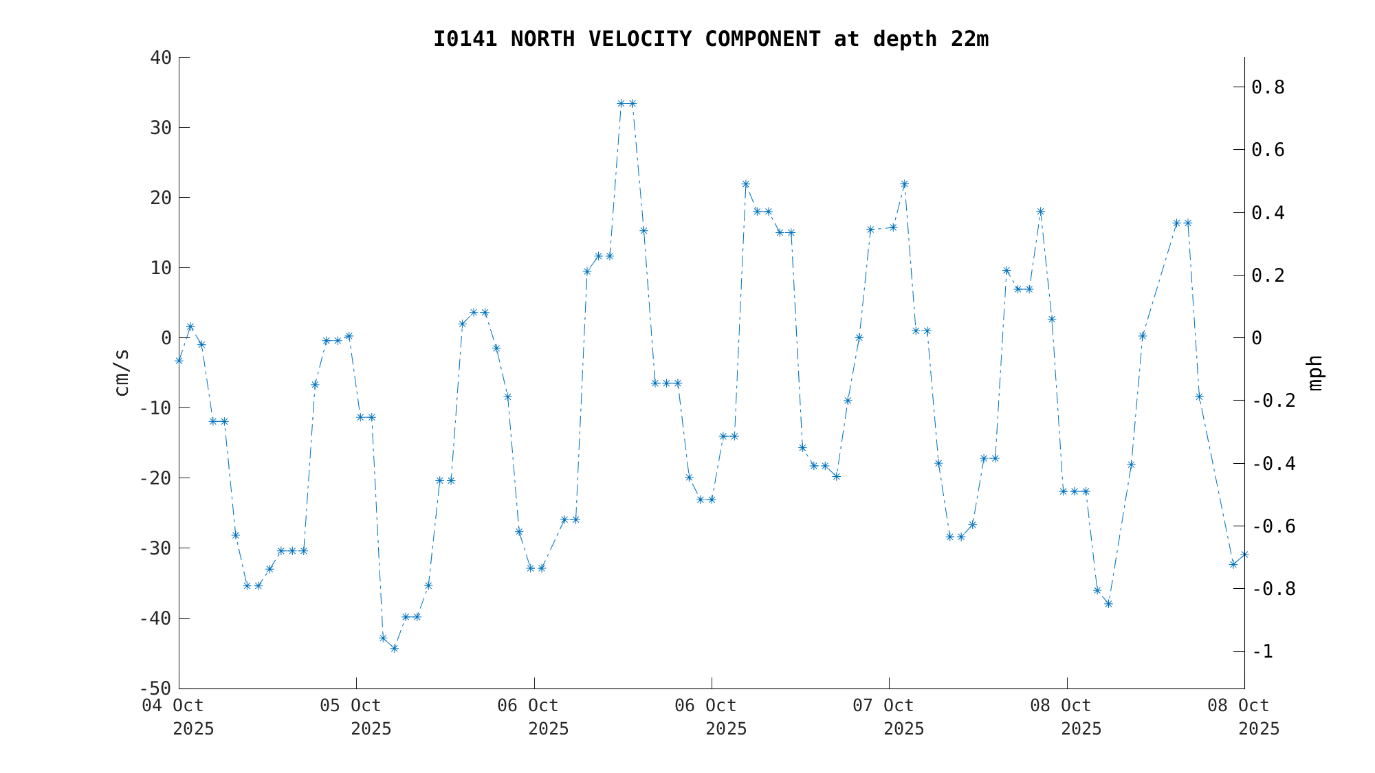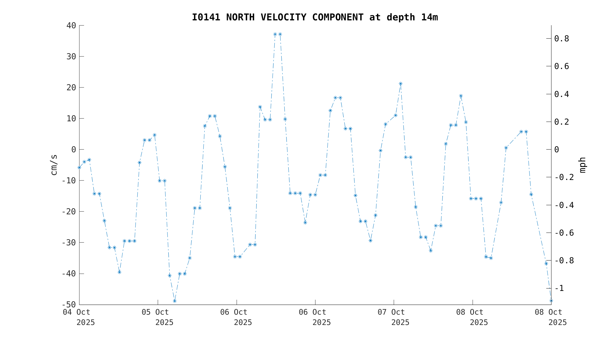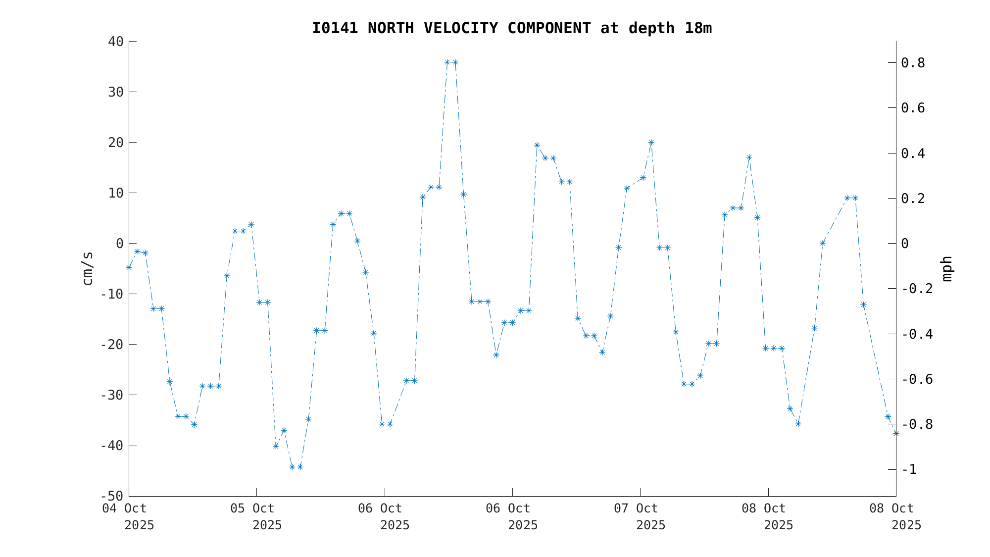 North Current Velocity (18m) | -34.3 cm/s (-0.67 kts) | Oct 08 3:00 PM |