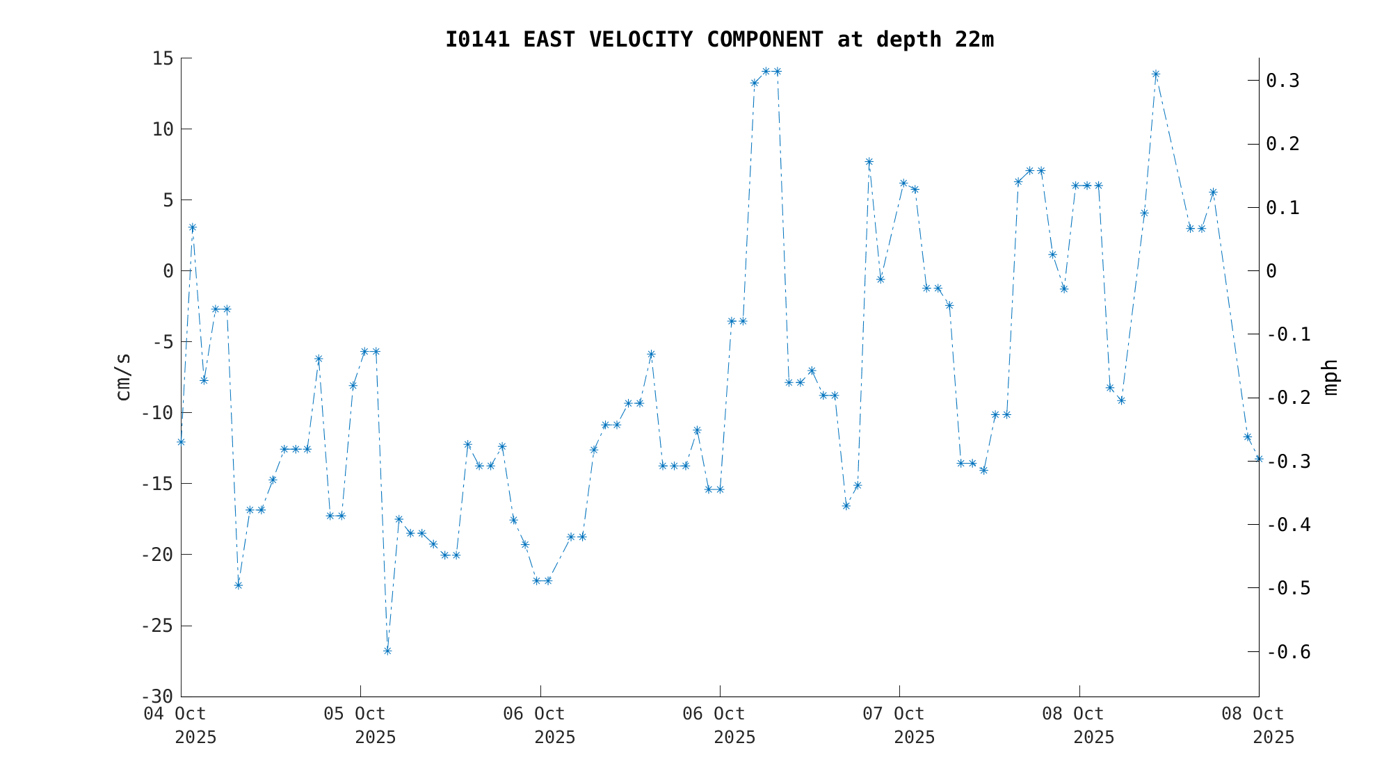 North Current Velocity (22m) | -32.3 cm/s (-0.63 kts) | Oct 08 3:00 PM |