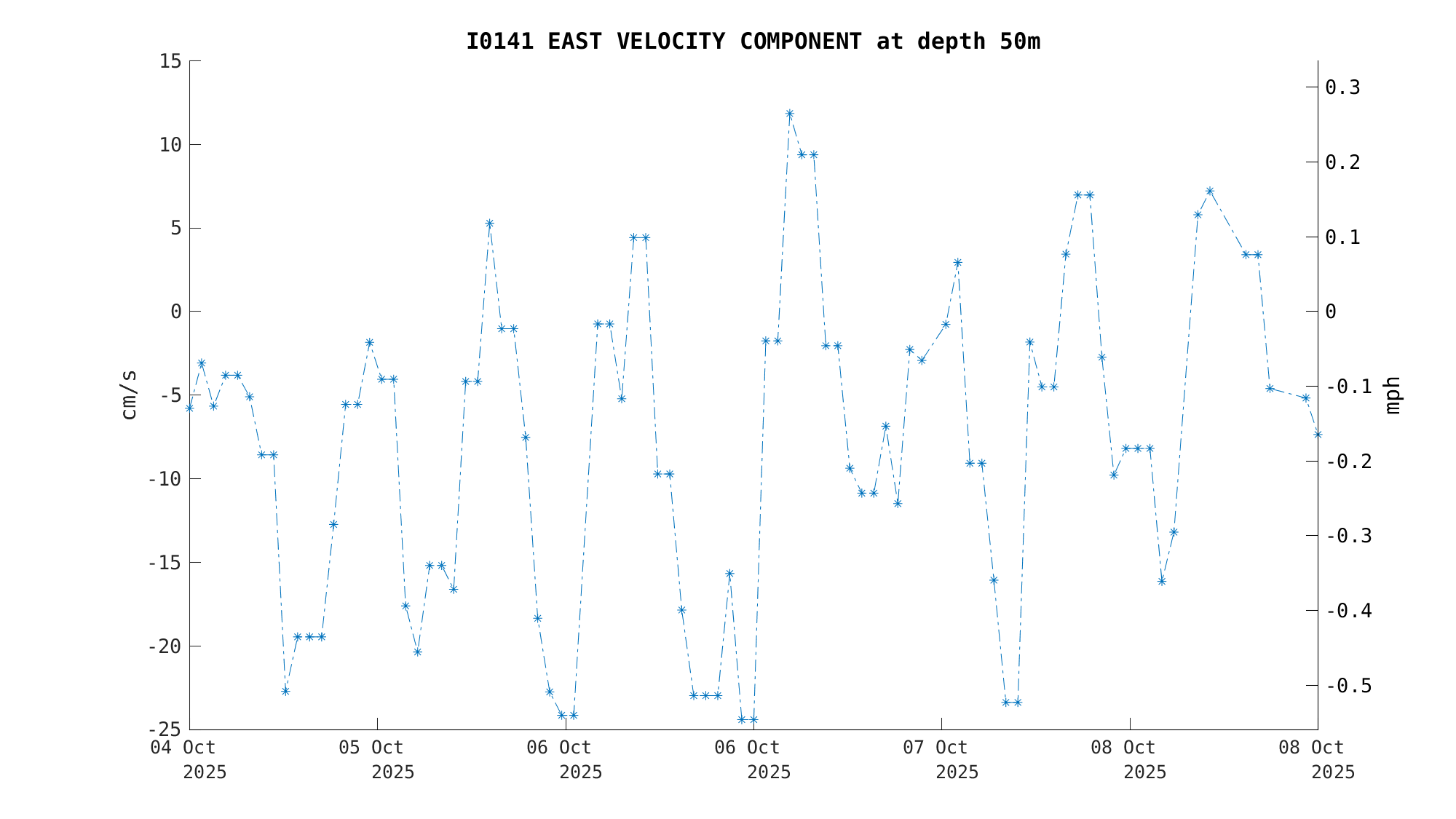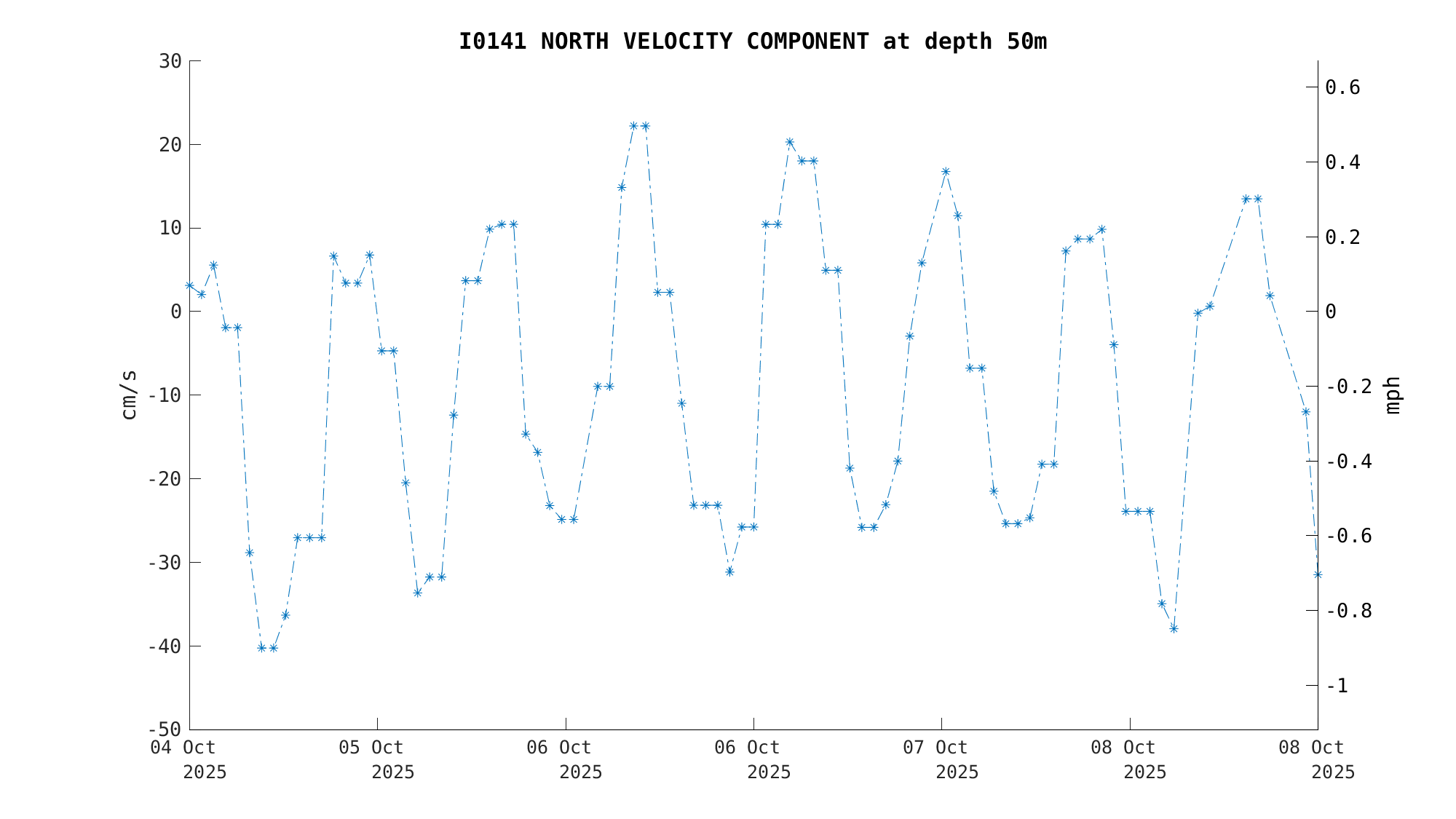North Current Velocity (50m) | -12.0 cm/s (-0.23 kts) | Oct 08 3:00 PM |