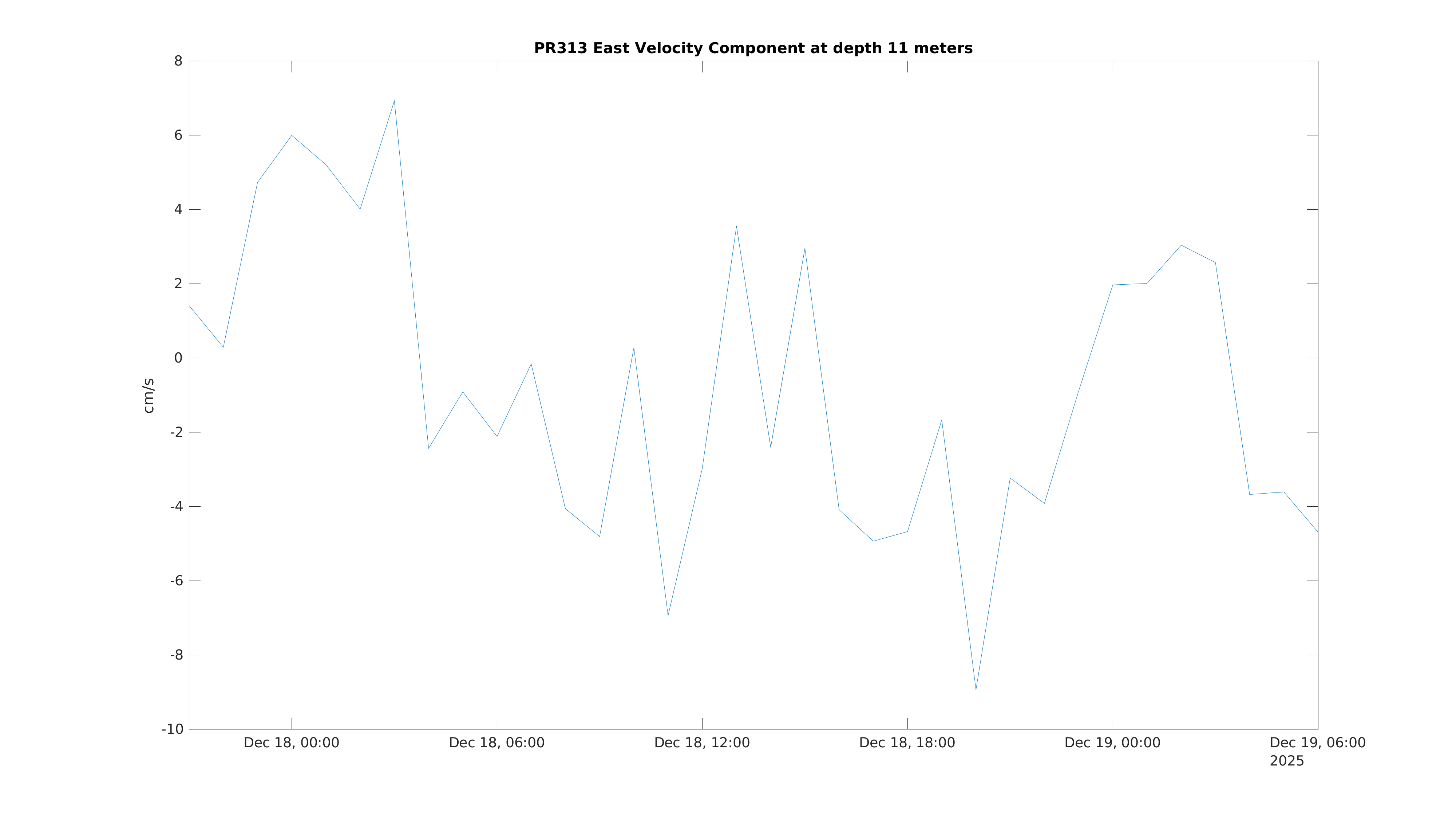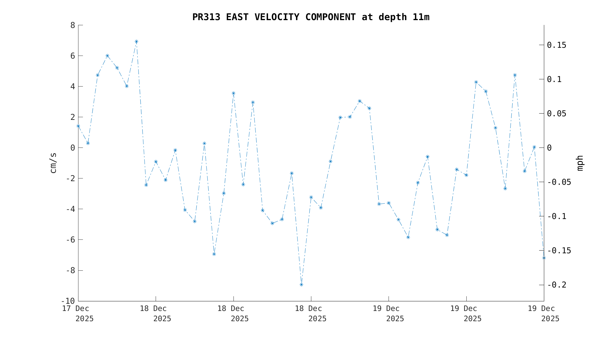 | East Current Velocity (11m) | -5.7 cm/s (-0.11 kts) | Dec 19 7:00 AM |