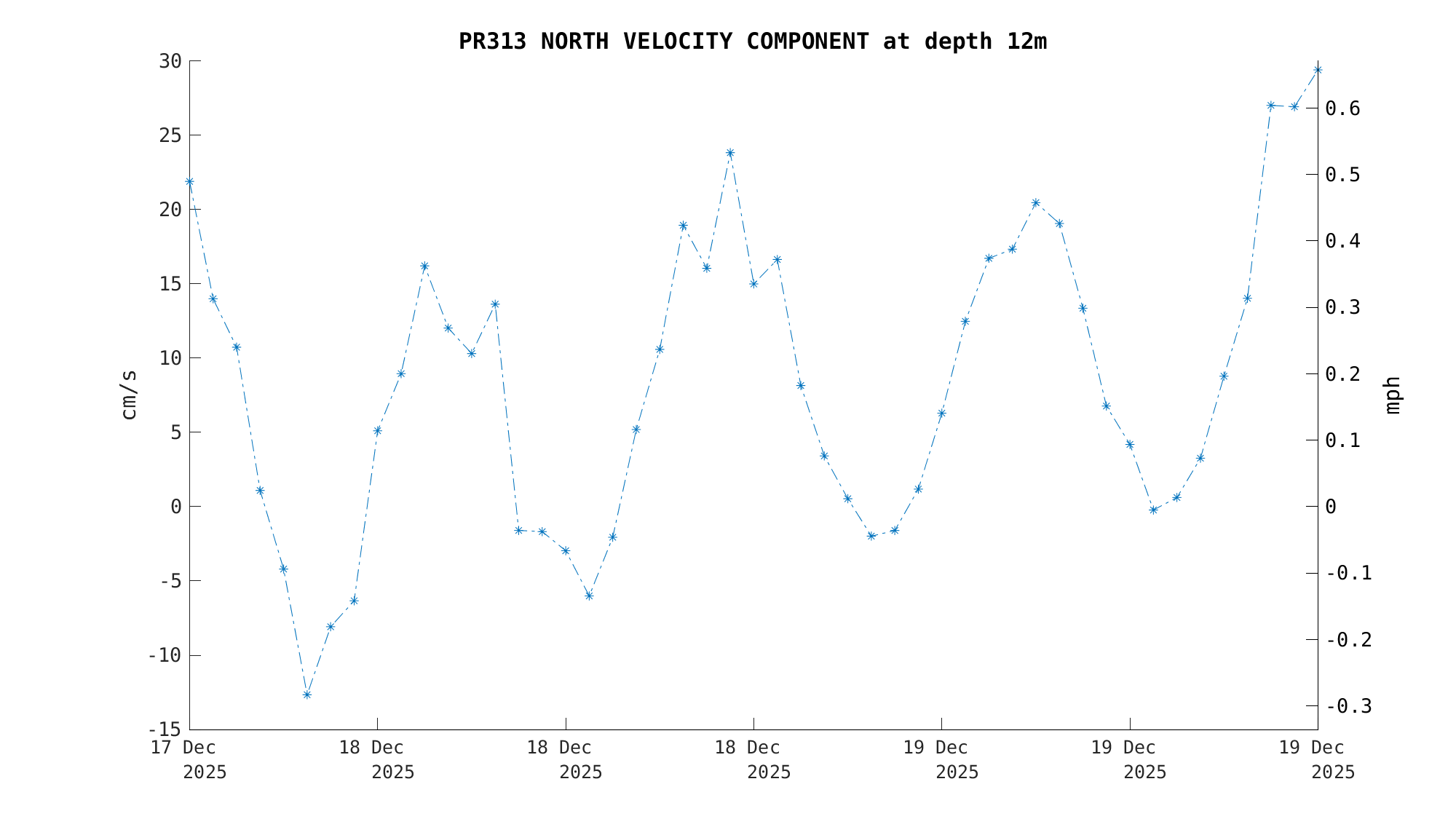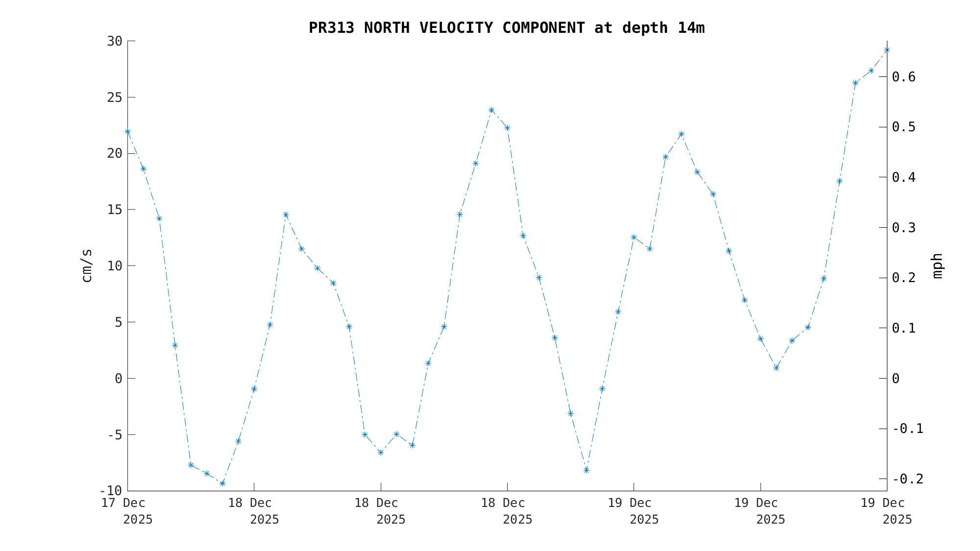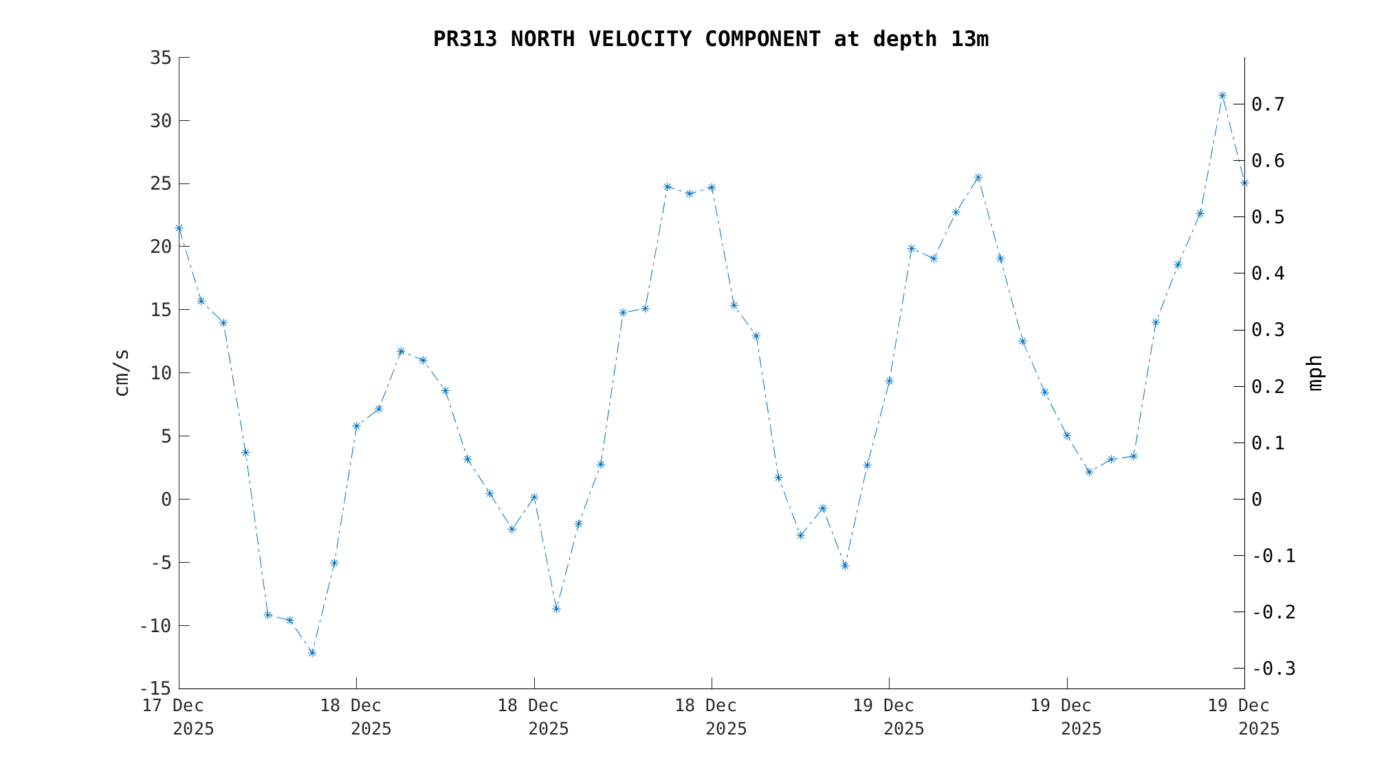 | North Current Velocity (13m) | 12.5 cm/s (0.24 kts) | Dec 19 7:00 AM |