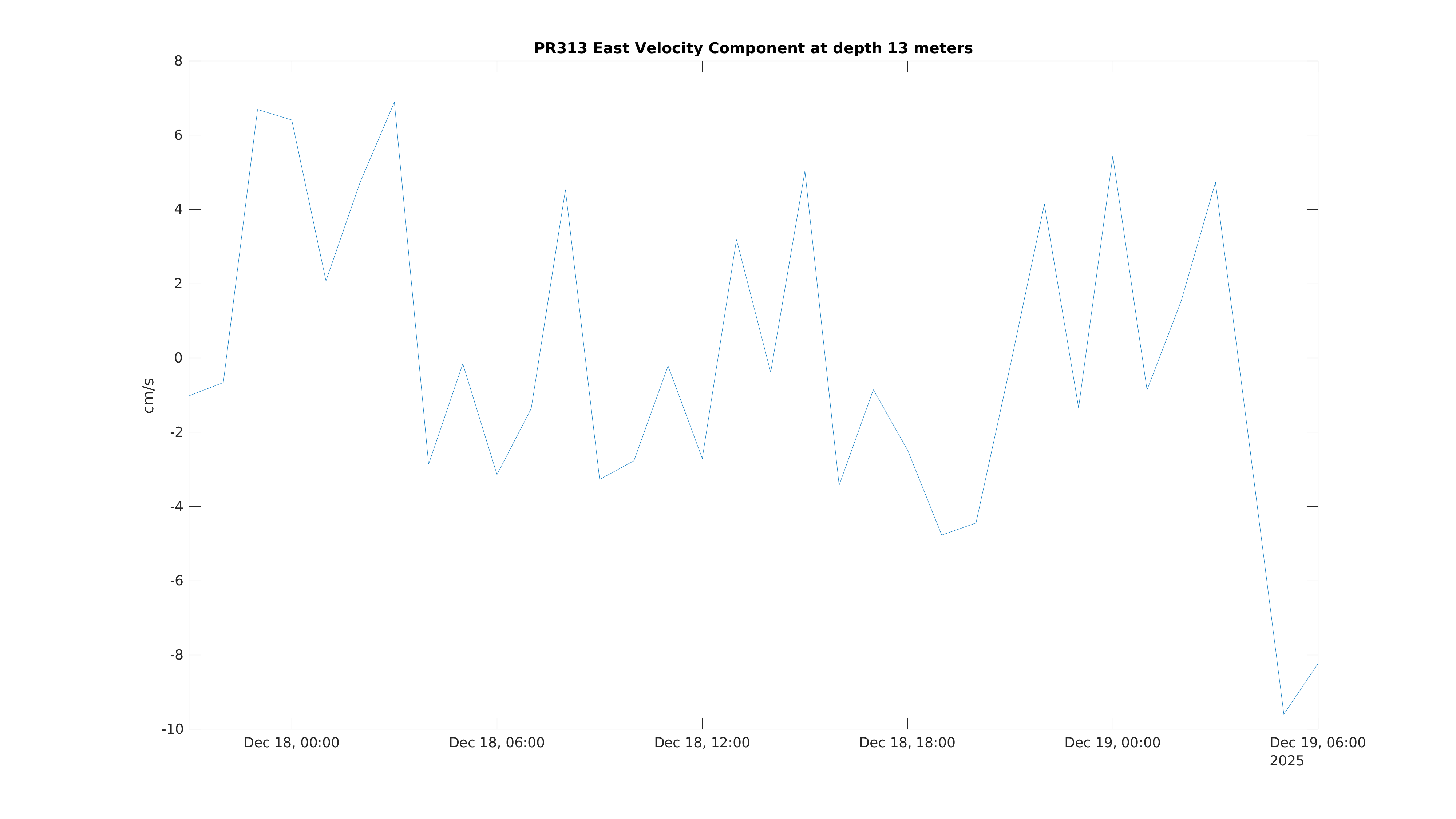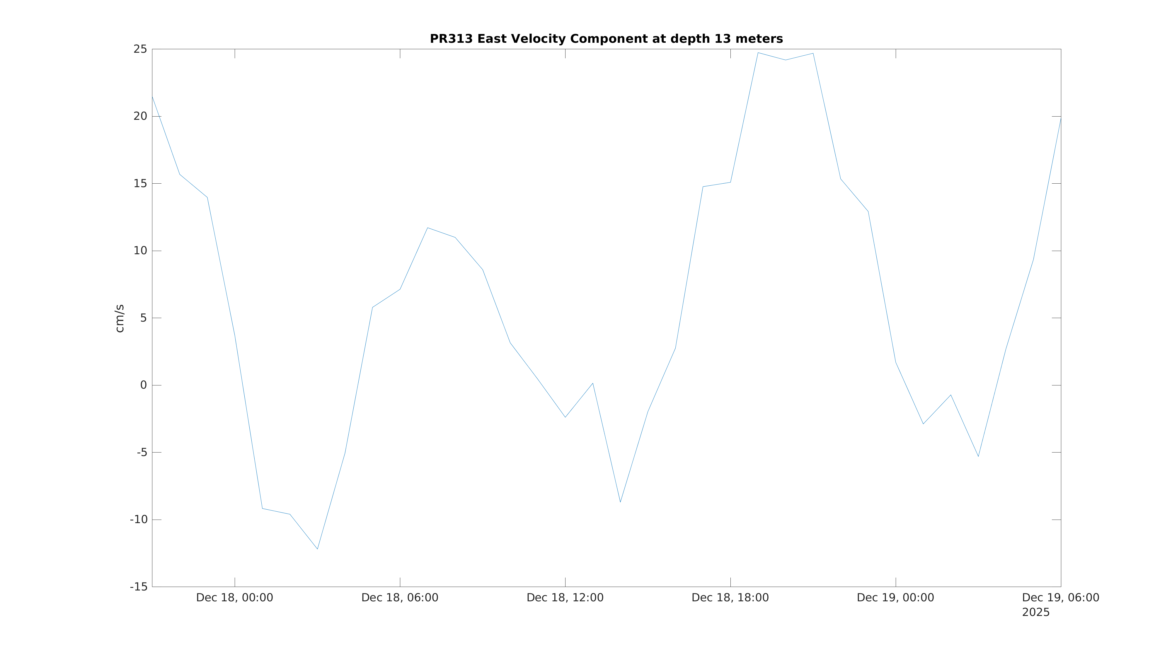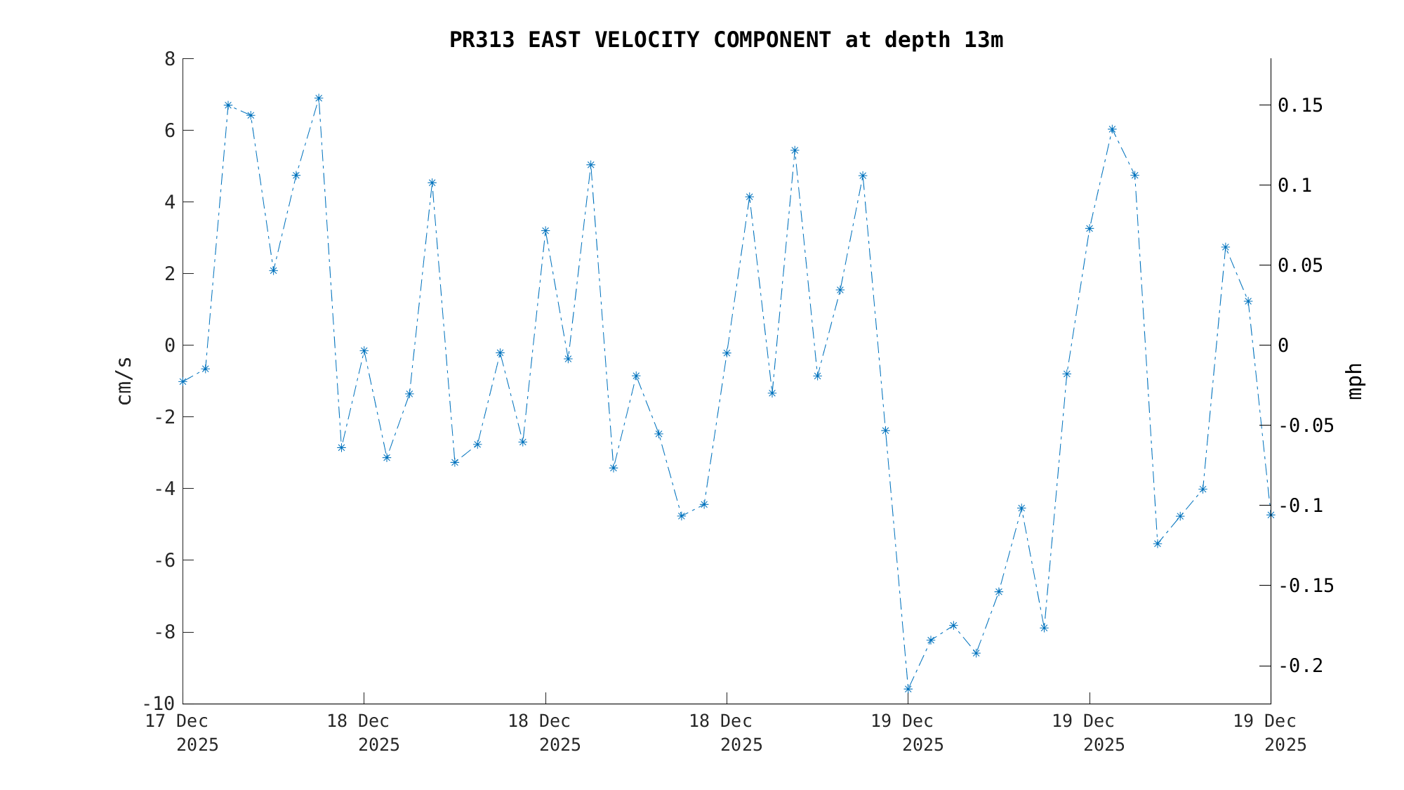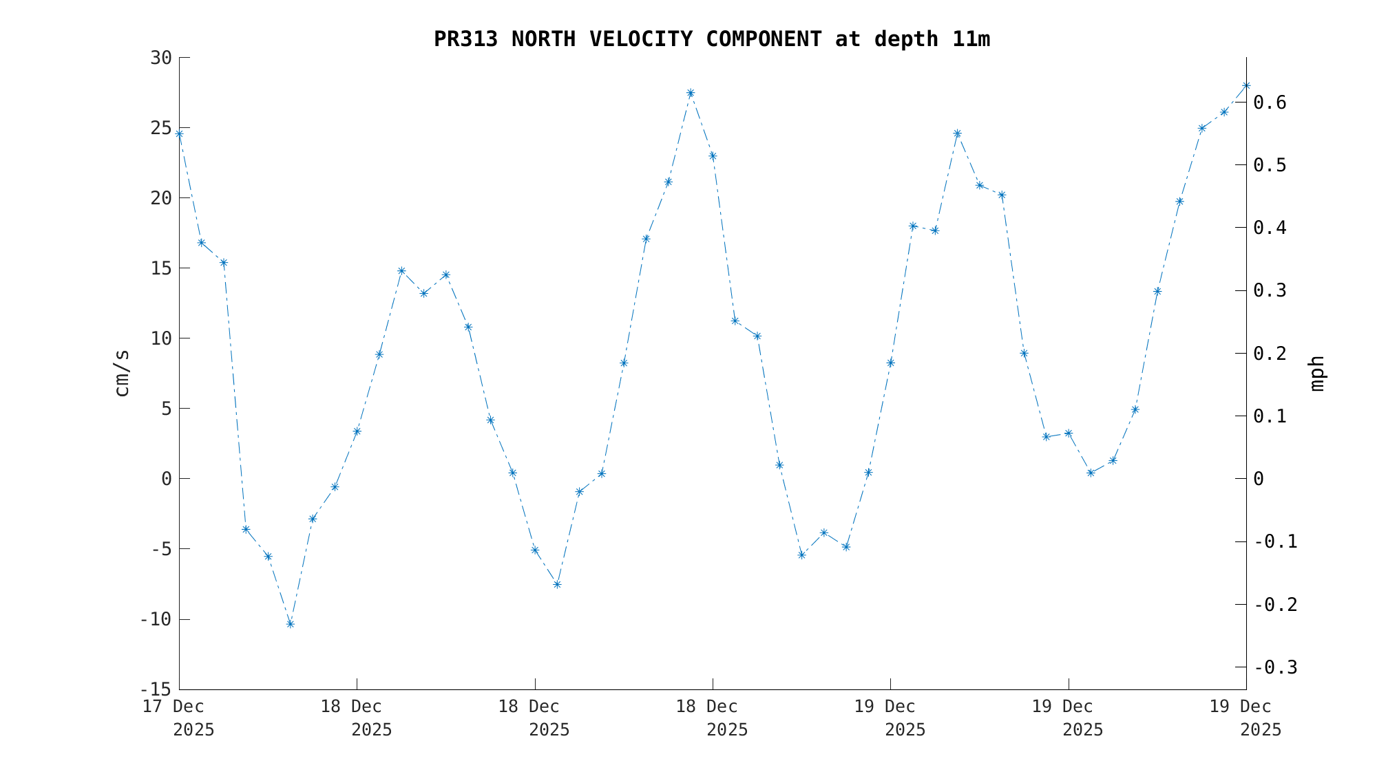 | North Current Velocity (13m) | 12.5 cm/s (0.24 kts) | Dec 19 7:00 AM |