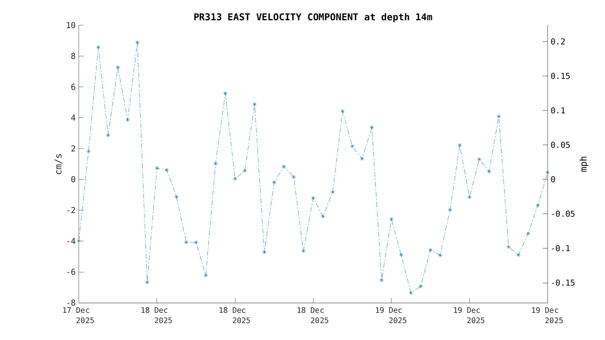 | East Current Velocity (14m) | -2.0 cm/s (-0.04 kts) | Dec 19 7:00 AM |