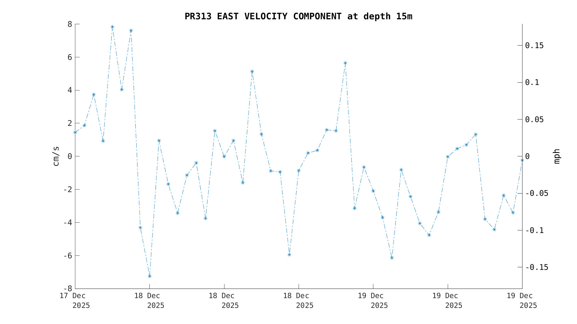 | East Current Velocity (15m) | -4.8 cm/s (-0.09 kts) | Dec 19 7:00 AM |