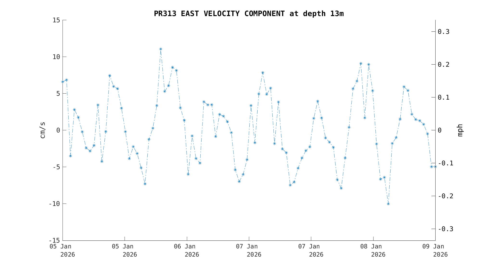 | Current Speed (13m) | 10.8 cm/s (0.21 kts) | Jan 08 8:00 PM |