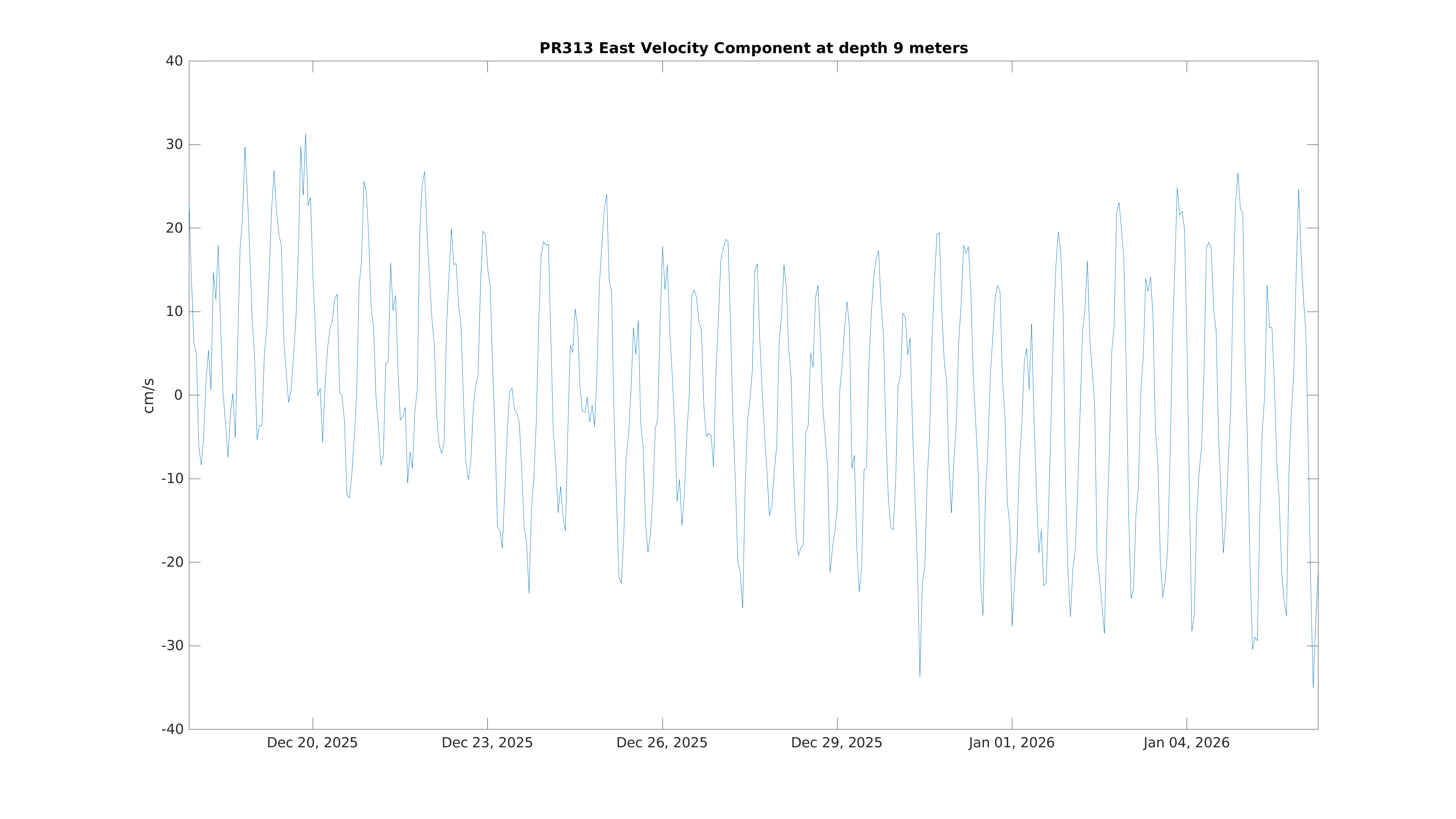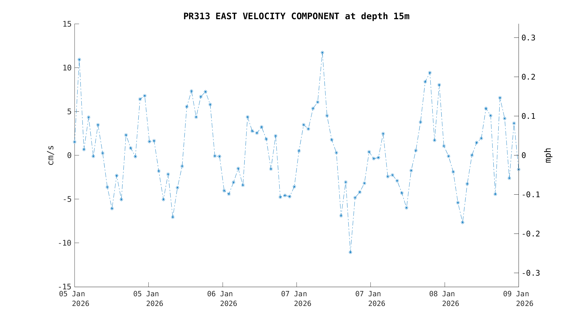 | East Current Velocity (9m) | -9.1 cm/s (-0.18 kts) | Jan 08 8:00 PM |