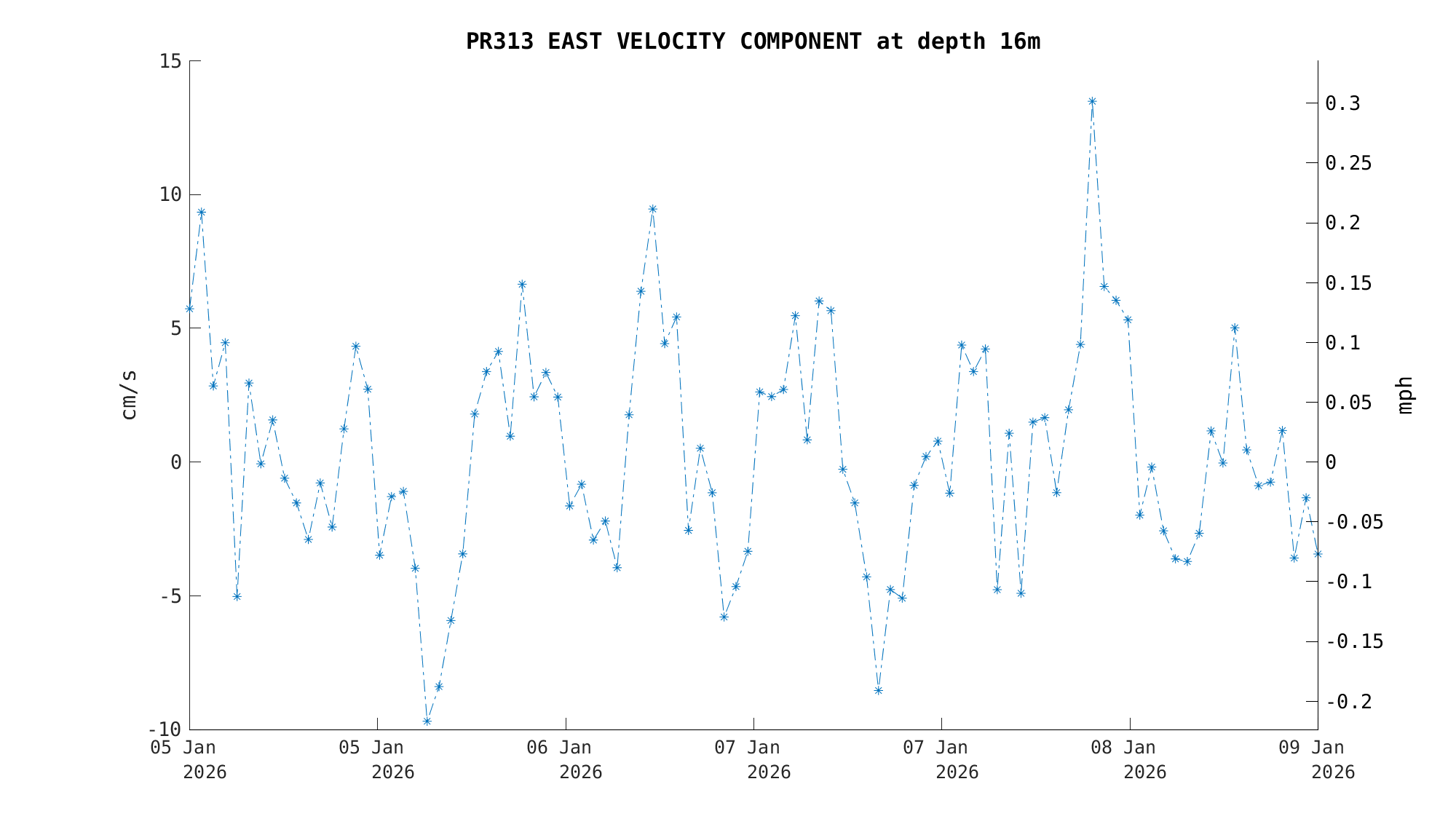 | East Current Velocity (16m) | -3.4 cm/s (-0.07 kts) | Jan 08 8:00 PM |