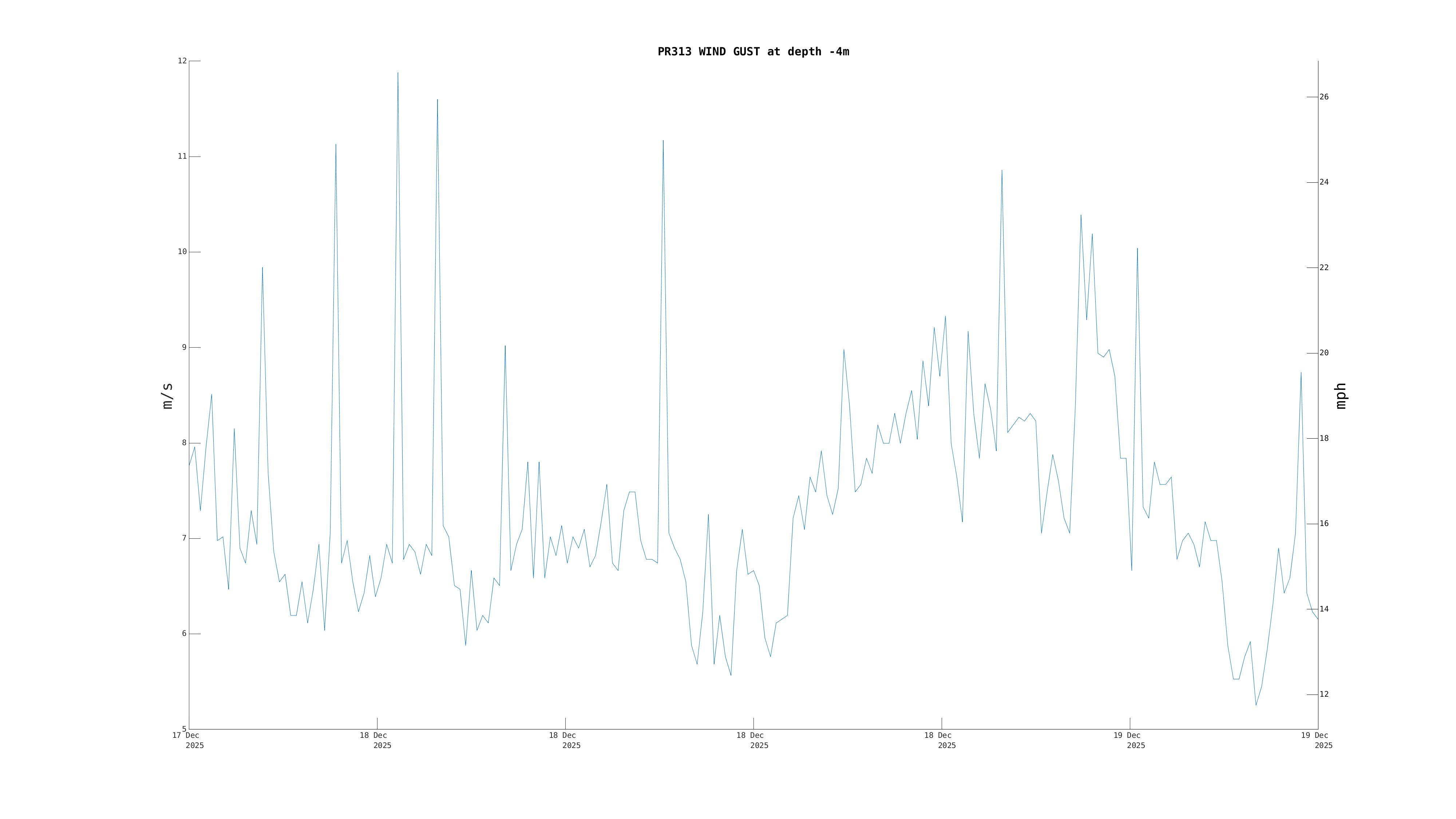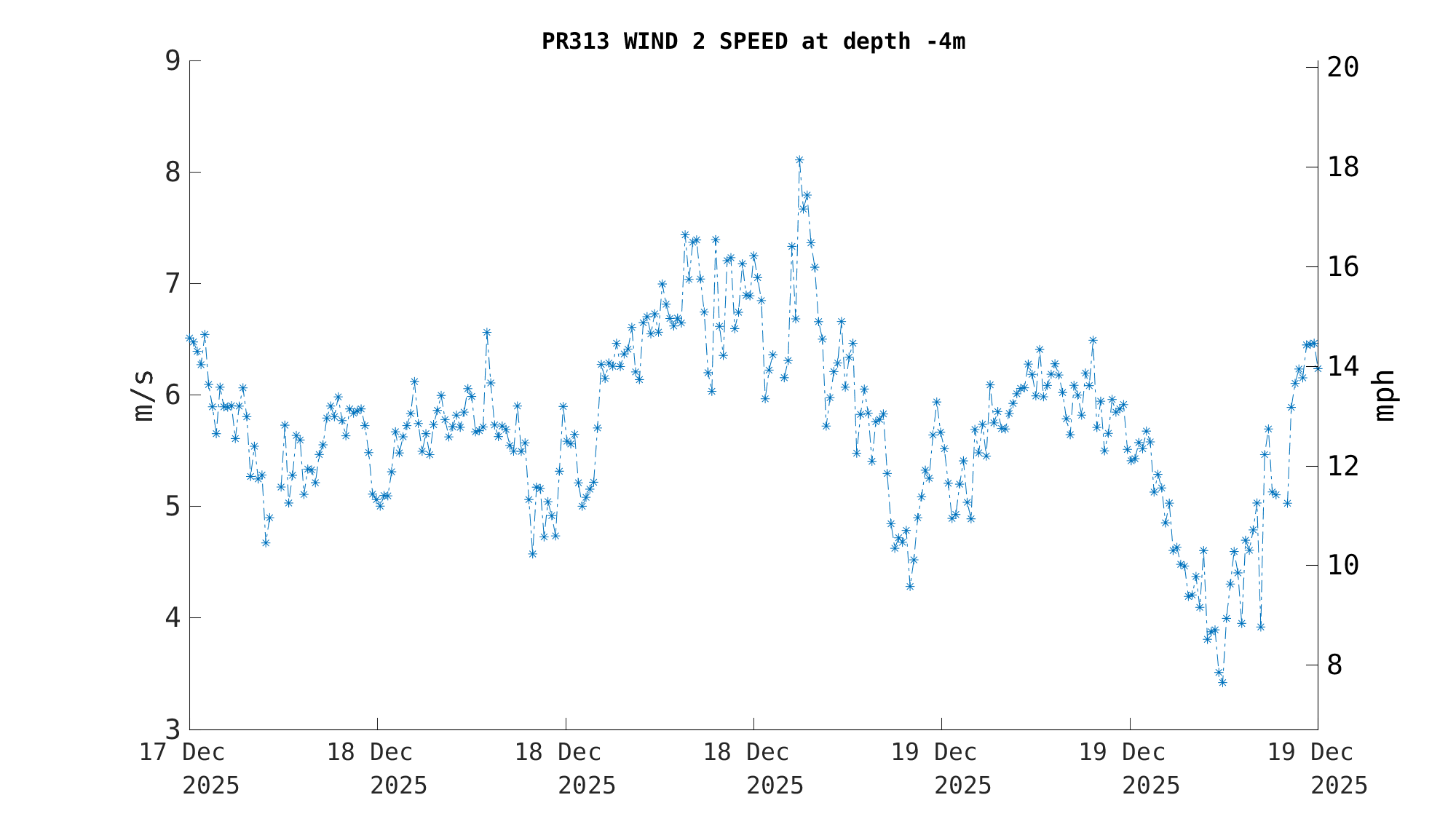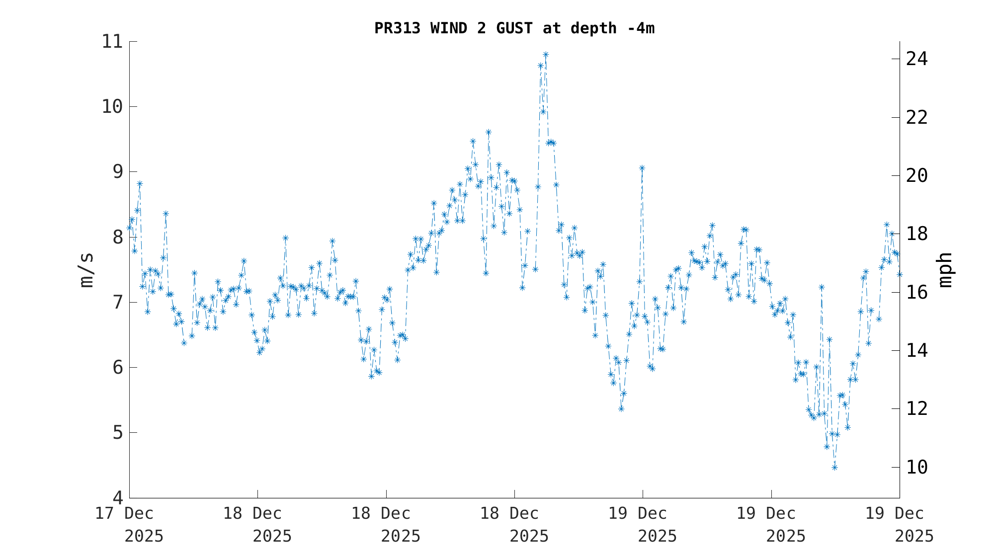 | Wind 2 Gust [Primary] (-4m) | 7.4 m/s (17 mph, 14 kts) | Dec 19 7:30 AM |