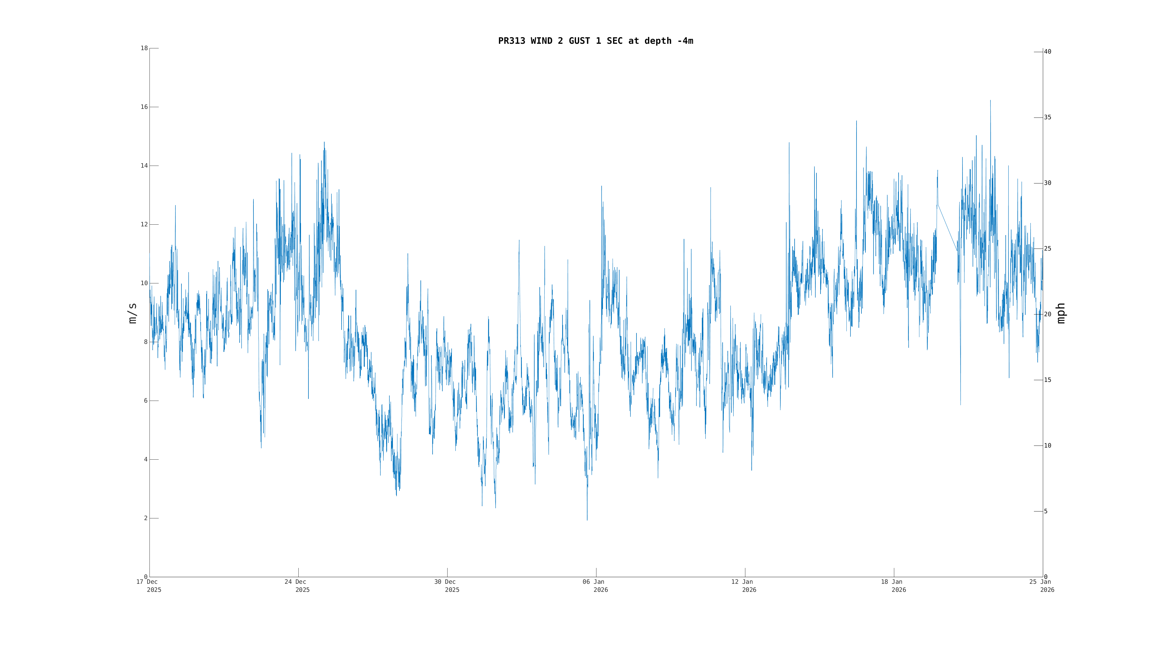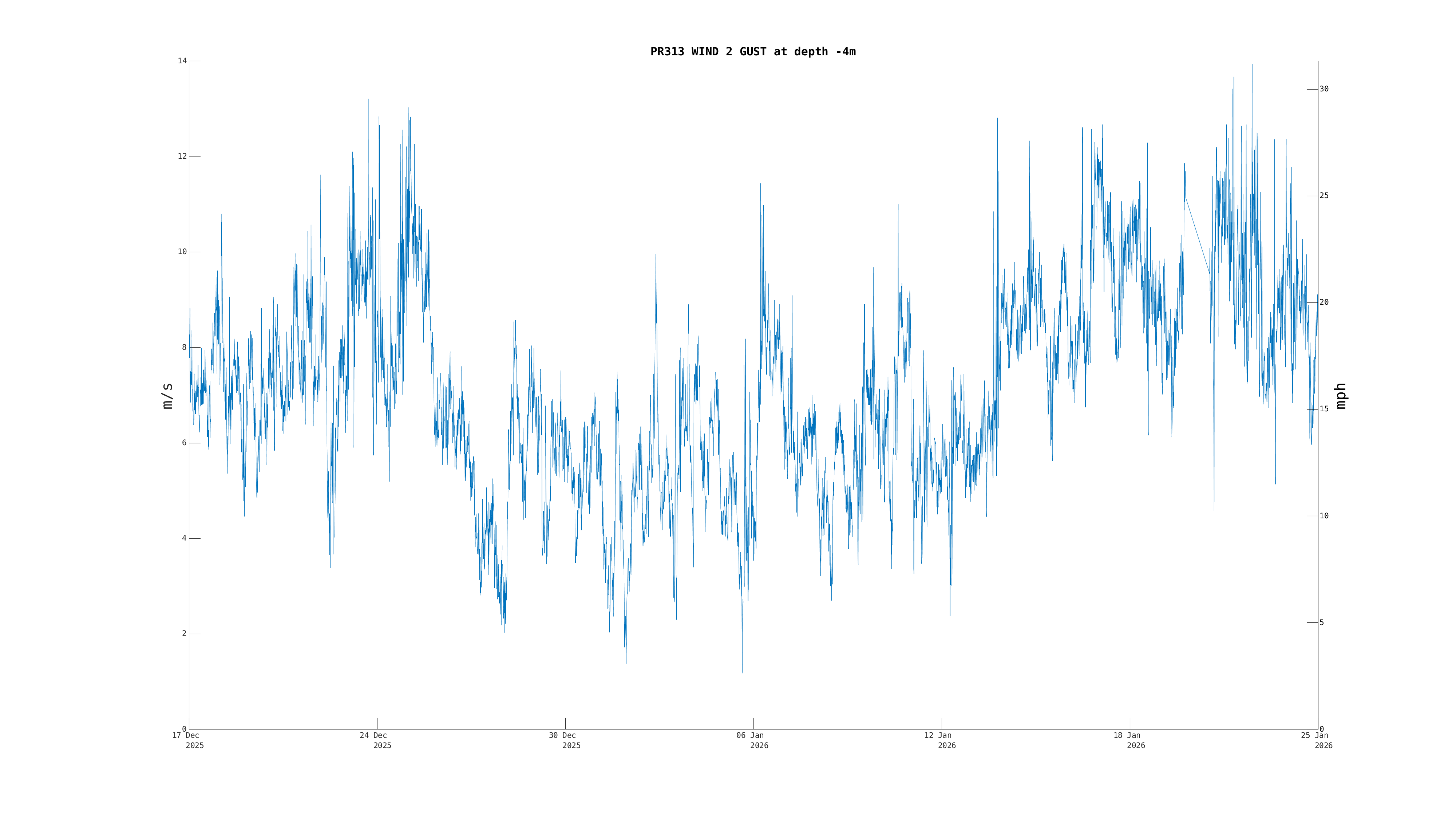 | Wind 2 Gust [Primary] (-4m) | 8.1 m/s (18 mph, 16 kts) | Jan 25 6:35 AM |