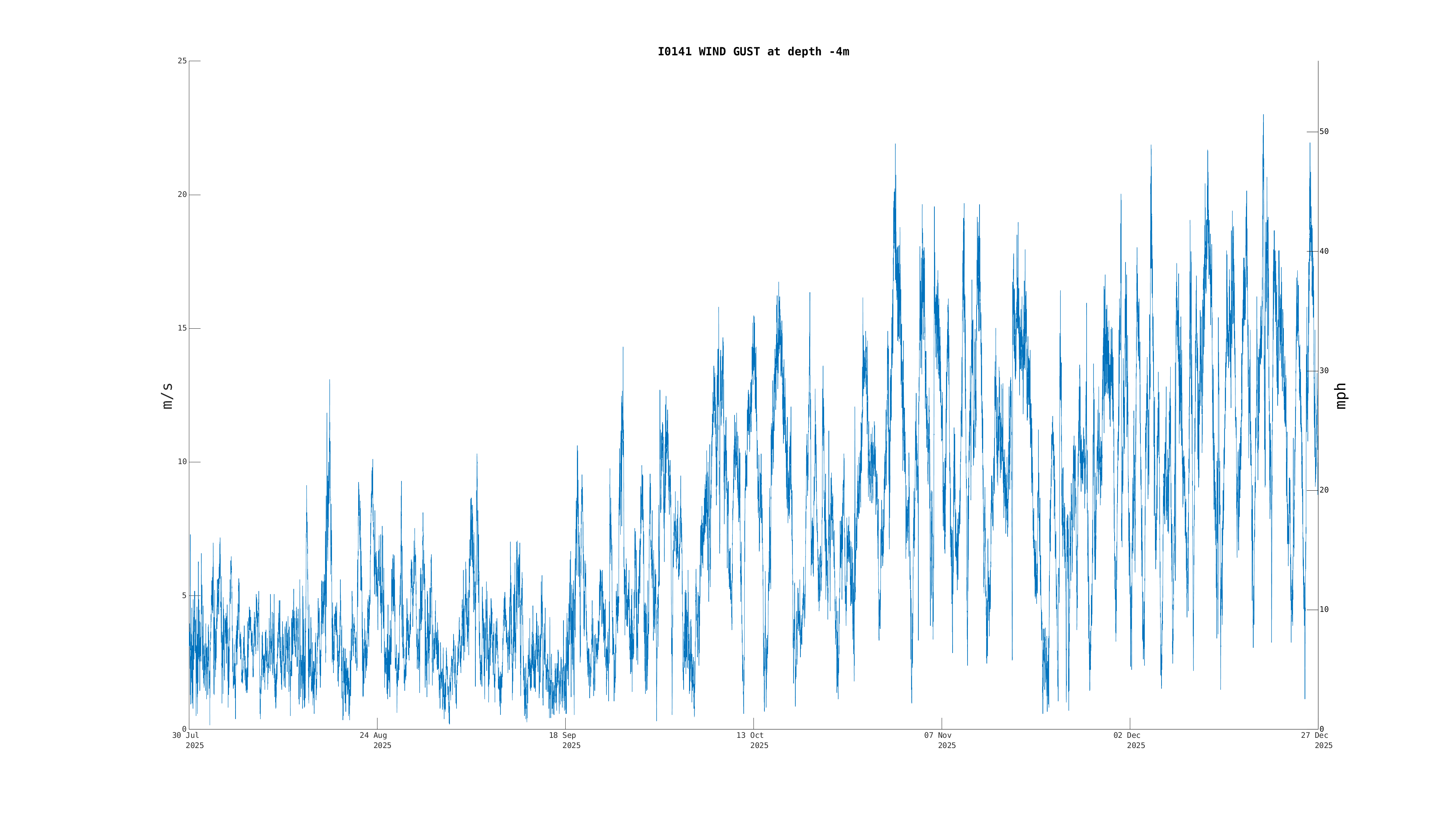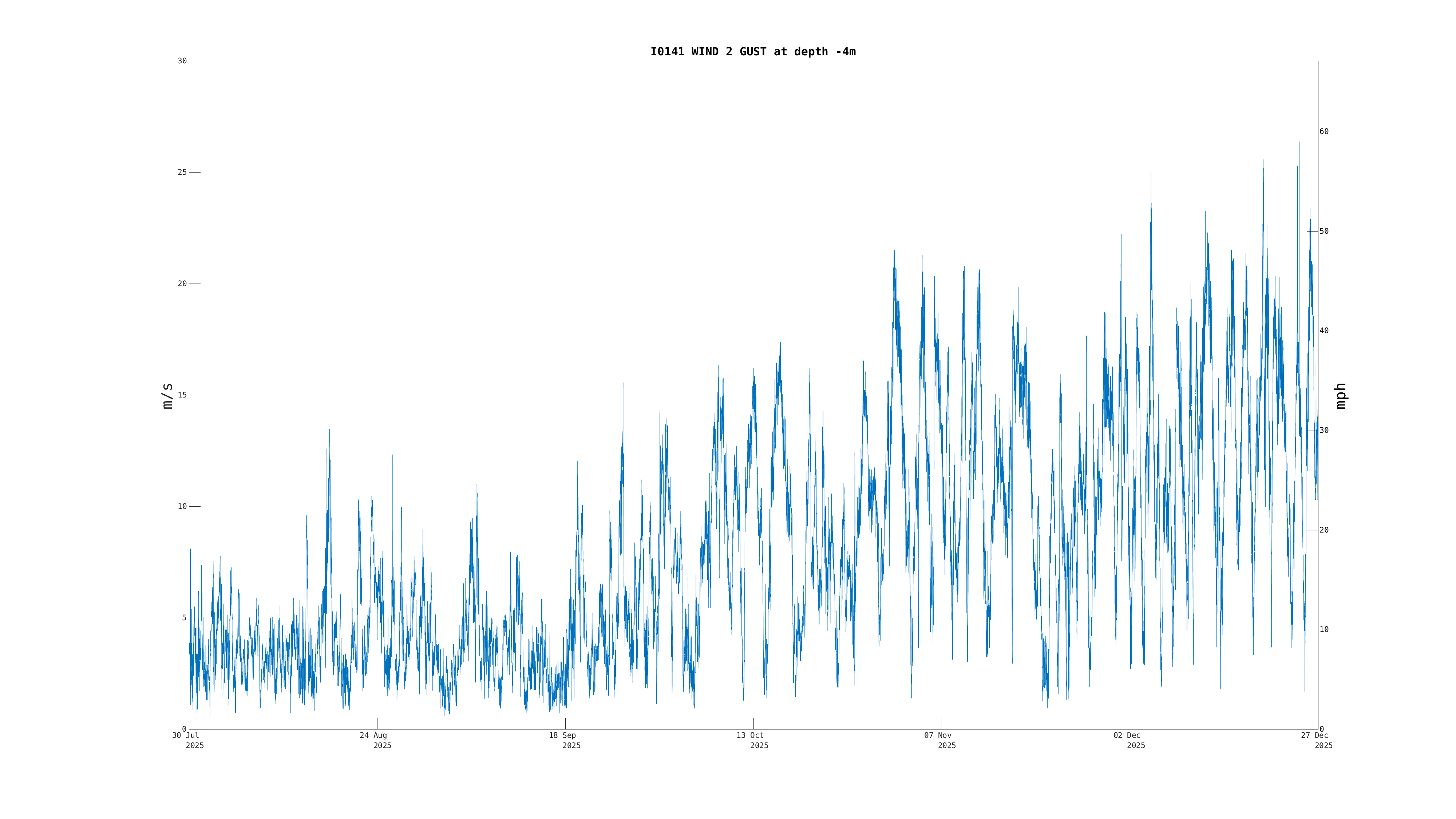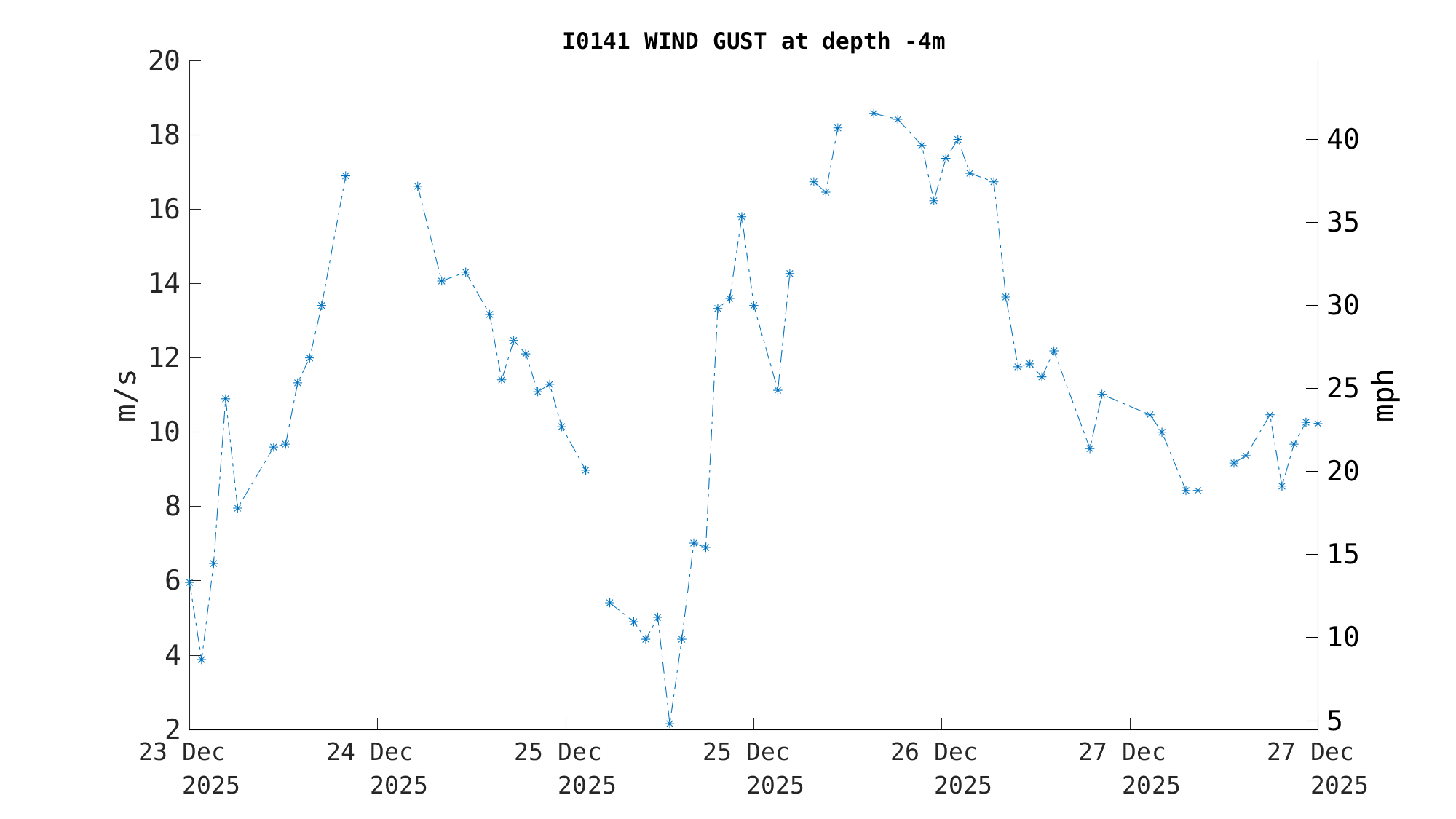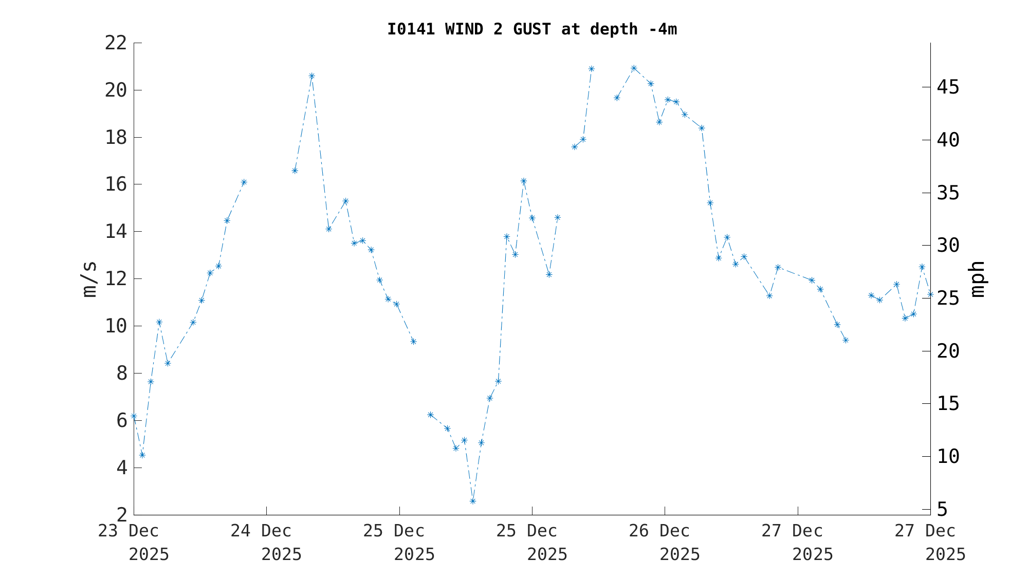 | Wind 2 Gust [Primary] (-4m) | 12.1 m/s (27 mph, 23 kts) | Dec 26 10:30 PM |