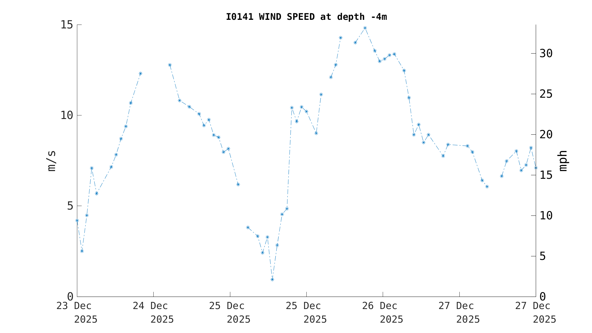 | Wind Speed (-4m) | 7.4 m/s (17 mph, 14 kts) | Dec 26 10:30 PM |