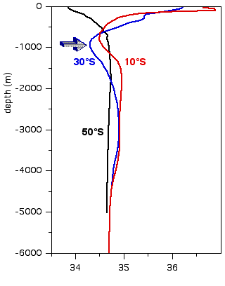 You are correct. At the station located at 30°S (the blue salinity profile), the salinity minimum is found just above 1000 m depth.