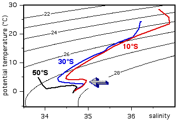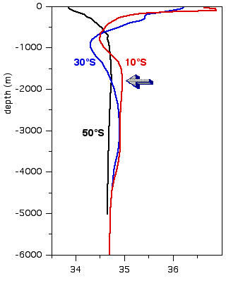 You are correct. At the station located at 10°S (the red salinity profile), the salinity maximum is found at abolut 1800 m depth.