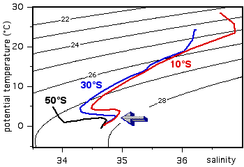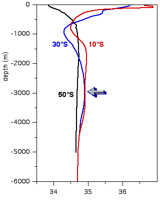 You are correct. At the station located at 30°S (the blue salinity profile), the salinity maximum is found at abolut 3000 m depth.