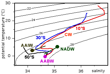 The salinity maximum indicates the presence of North Atlantic Deep Water (NADW). This water mass is formed in the Greenland and Labrador Seas where it sinks to about 3000 m depth and moves southward through the Atlantic Ocean, eventually reaching the Southern Ocean and from there entering all other oceans. The diagram above shows it as a green circle. Like AAIW, the NADW mixes with the water below and above, which reduces its salinity as it progresses southward and produces a southward decrease of the associated salinity maximum along the green line shown in the diagram.