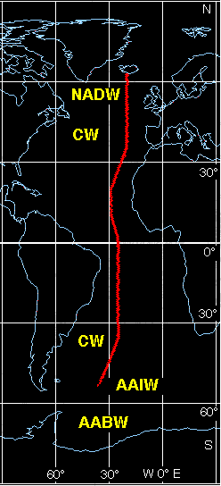 The convergence of all TS-curves towards one TS-point at low temperatures indicates the presence of Antarctic Bottom Water (AABW). This water mass is formed at the Antarctic continent, where cool and saline surface water sinks down the continental slope to the ocean floor. AABW spreads northward from the Southern Ocean and fills all oceans below about 4000 m depth. |