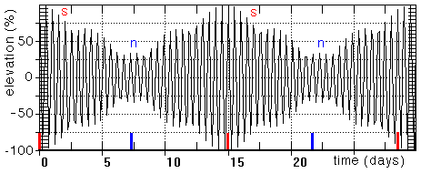 This figure shows the tide that results from the combined movement of earth, moon and sun seen in the animation of the last page. Note that the tidal range is particularly large at days 0 and 15 and