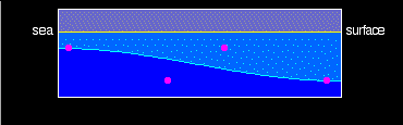 Un seiche de primer orden. El nivel del mar no perturbado se muestra por la línea amarilla. Los dos tonos de azul indican dos capas de agua cuya diferencia de densidades es pequeña. Se muestran cuatro partículas para indicar el movimiento del agua en el seiche interno.