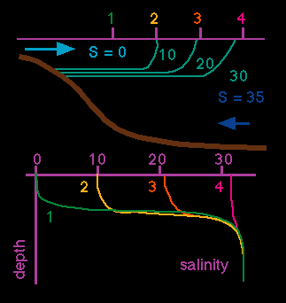 Salinity in a highly stratified estuary. Top: as a function of depth and distance along the estuary, numbers indicate station locations; bottom: in vertical salinity profiles for stations 1 - 4