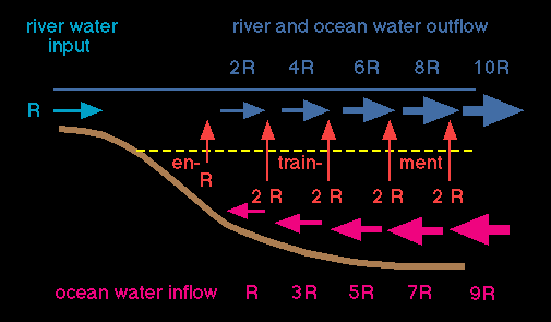 Sketch of mass transport in a highly stratified estuary. River volume input is R. Outflow from the estuary in the upper layer is 10R; this is compensated by inflow of oceanic water of 9R. The net outflow at the outer end of the estuary is of course still only 1R.