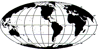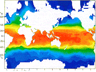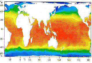 Comparación de las tres proyecciones. Izquierda: Proyección de Mercator, en medio: proyección de Gall/Peters (área equivalente), derecha: ejemplo de una proyección de área equivalente con cuadrícula de coordenadas curvas (Proyección Mollweide). Los mapas de color muestran la temperatura superficial del mar; proporcionan información idéntica - las diferencias en apariencia se deben exclusivamente a las diferentes proyecciones. Compare los mapas localizando el Ecuador, note la variación en la distancia entre latitudes sucesivas e intente determinar la longitud de su ciudad natal o universidad.