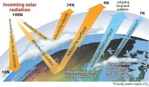 Absorción (16%), radiación de retorno (7%) y reflexión (24% desde las nubes, 4% desde la superficie terrestre) de la radiación de onda-corta entrante en la atmósfera. La radiación de onda-corta alcanza la superficie del oceáno directamente, como radiación dispersa por el cielo claro y como radiación dispersa pòr las nubes.
