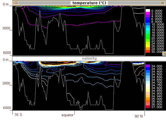 Temperatura (arriba) y salinidad (abajo) en función de la latitud y profundidad en el Océano Pacífico. (La imagen incluye el Océano ártico en el extremo derecho.)