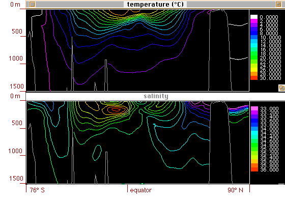 Temperatura (arriba) y salinidad (abajo) como funciones de la latitud y profundidad en los 1500 m superiores del Océano Pacífico. (La imagen incluye al Océano Ártico en el extremo derecho).