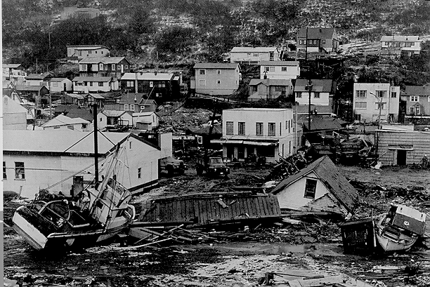 Tsunami damage in Kodiak, Alaska, after the tsunami of 27 March 1964. This tsunami caused the death of 21 people and $30 million damage to property in and around Kodiak.