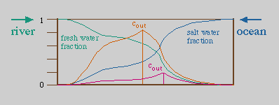 Sketch diagram for the distribution of conservative pollutants in an estuary. The salt water fraction and fresh water fraction are shown by thin curves. Two examples of conservative pollutant distributions are shown. The outlets are at the vertical lines, where the initial concentrations are given by their respective values of cout. The concentrations downstream from the outlet are proportional to the fresh water fraction, the concentrations upstream are proportional to the salt water fraction.