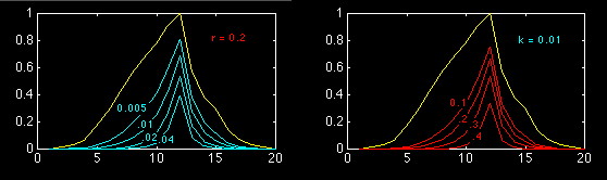 A theoretical example for concentration distributions of a non-conservative pollutant. The estuary is assumed to consist of 20 compartments with constant r. The pollution outlet is located in compartment 12. The yellow curves show the concentration distribution for a conservative pollutant.