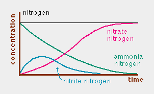 An example for coupled non-conservative pollutants. Ammonia nitrogen is introduced into a marine environment. It decays with time, producing nitrite nitrogen and nitrate nitrogen. The nitrite nitrogen goes through a peak concentration and then decays as well. The final product nitrate will be taken up by marine plant life. Whether it constitutes a pollutant or has a positive influence on the ecosystem depends on the oxygen demand in the process. (See the text and Figure 16.5.)