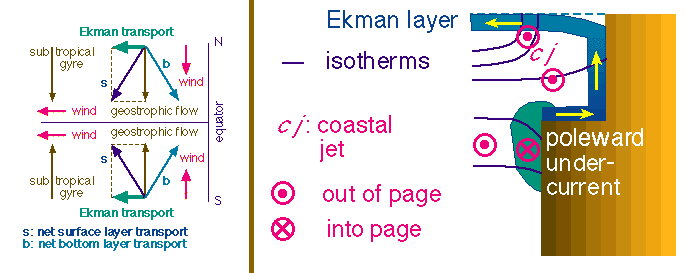 The surface Ekman layer transport is directed 90° to the right (left) of the wind direction south (north) of the equator, producing offshore surface water movement in both hemispheres. This lowers the sea surface near the coast. The result is a pressure gradient normal to the shore, which drives a geostrophic current along the coast, in the same direction as the wind.