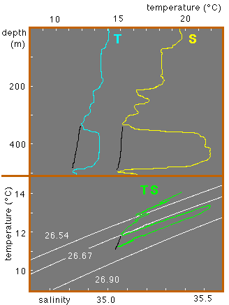Water is indicated by the high salinity and temperature at 350 - 450 m depth. In the TS-diagram the presence of Bass Strait Water is indicated by a thin wedge that follows a level of constant density. (Selected constant density curves (isopycnals) are shown in white.) Stations without Bass Strait Water presence display properties indicated by the black lines. See Figure 9.7 for the location of the station.