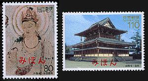 A wall painting (left) from the kondo (right) of the Horyuji temple near Nara on Japanese postage stamps.