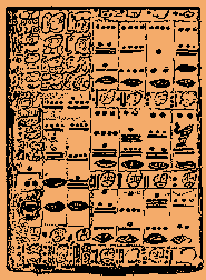 This sketch of a page from the Dresden Codex, one of the only three Mayan documents that escaped the book burnings of the Spanish priests, lists multiples of the the synodic period of Venus. The four numbers in the upper right show the digits
