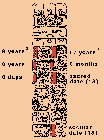 This sketch of one of the gigantic stelae of Quiriguá in today's Guatemala shows the three ways in which the Mayans recorded dates.