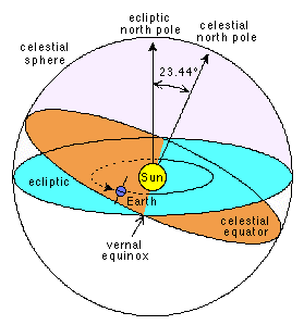 The ecliptic is the plane in which the Earth rotates around the Sun. It is inclined by 23.44° against the celestial equator, which is perpendicular to the line through the Sun and the celestial north pole; this line is parallel to the Earth's axis.