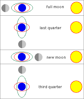 This diagram shows the sun (yellow) on the right, the earth (blue) and the moon (grey; the illuminated side is light grey).