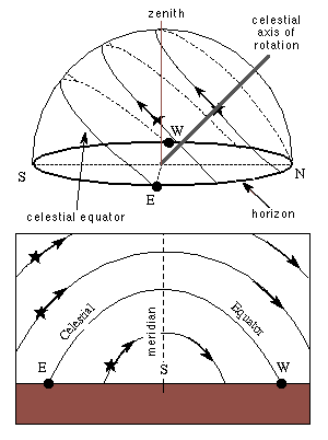 This diagram shows the apparent movement of the stars at a mid-latitude location in the northern hemisphere. The celestial axis of rotation is parallel to the earth's axis.